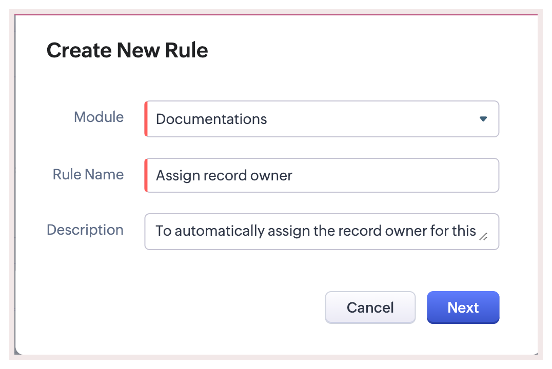 - 在 创建新规则 页面, 选择模块 (如文档团队模块)。输入 规则名称和描述,点击 下一步。