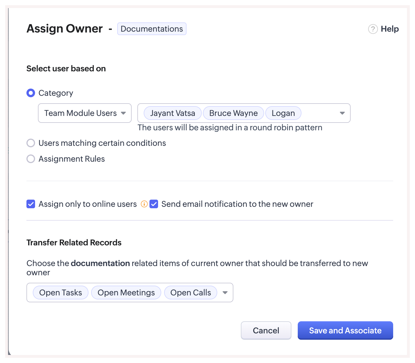 在分配所有者 页面, 选择 团队模块用户 作为类别,确保记录分配给该特定团队模块的用户。从下拉菜单中手动选择在线的用户或添加到该团队模块的所有用户。系统将以轮流方式分配用户。此外,您可以选择在用户成为所有者时向他们发送通知,并将待办任务、未完成会议和未完成电话等相关记录转移给所有者。点击 保存并关联 完成。