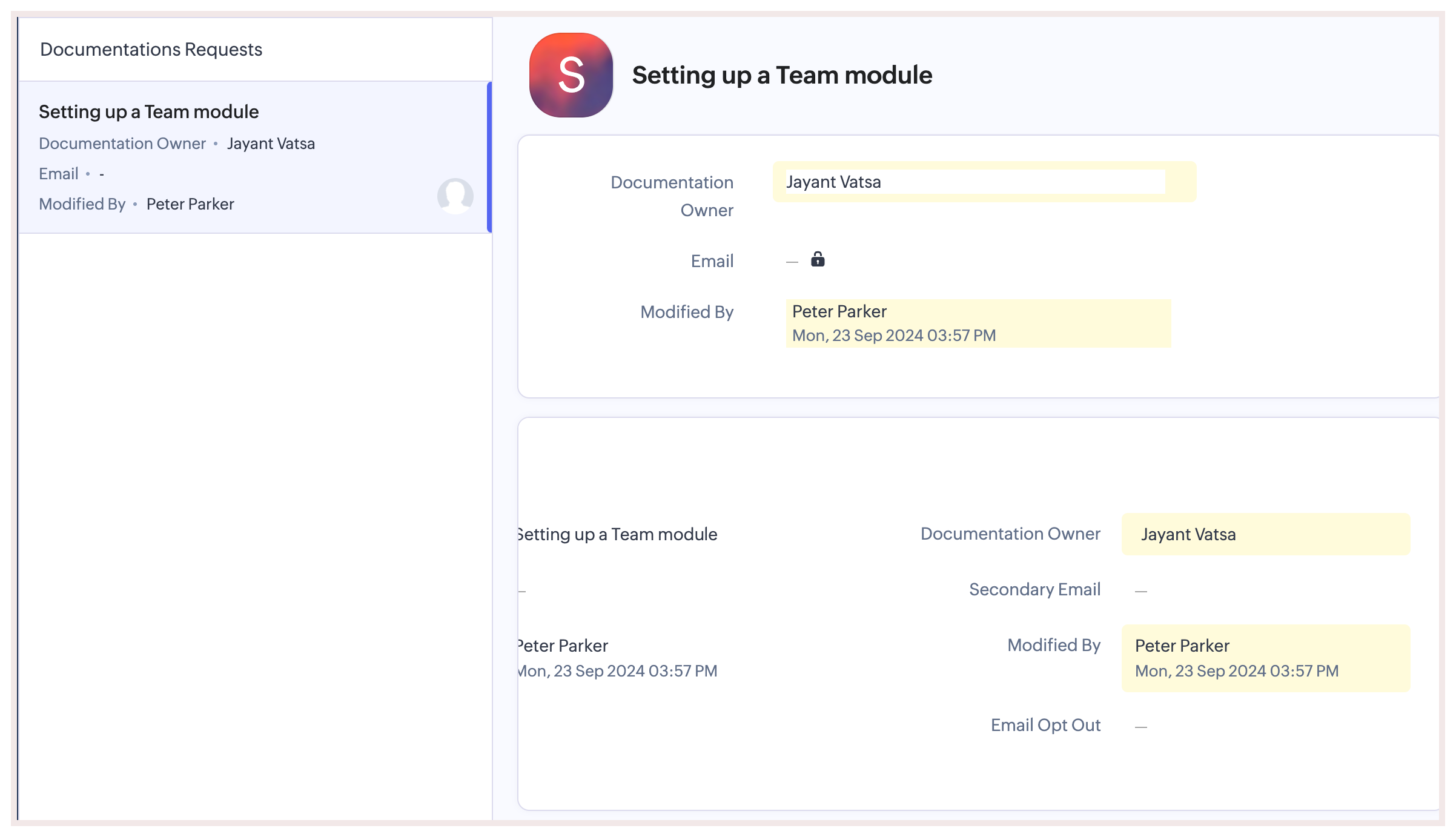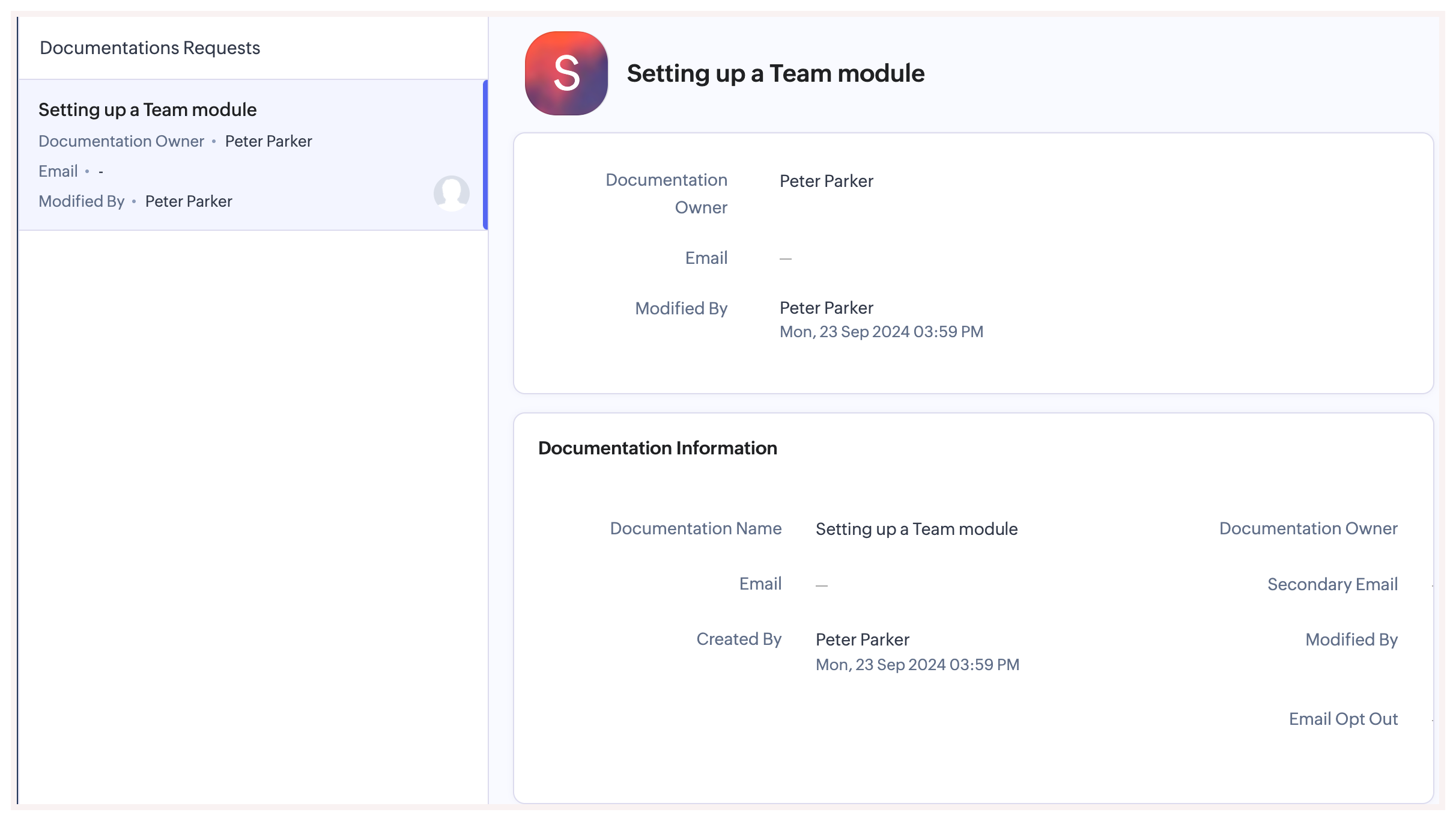 例如,如果 Peter Parker 是文档团队模块的请求者并添加了请求,那么他会默认成为文档的所有者。理想情况下是不应该发生这种情况的,因为 Peter Parker 无法访问文档模块,也不能编辑、删除或查看任何记录,除非是他自己请求的那条记录。
