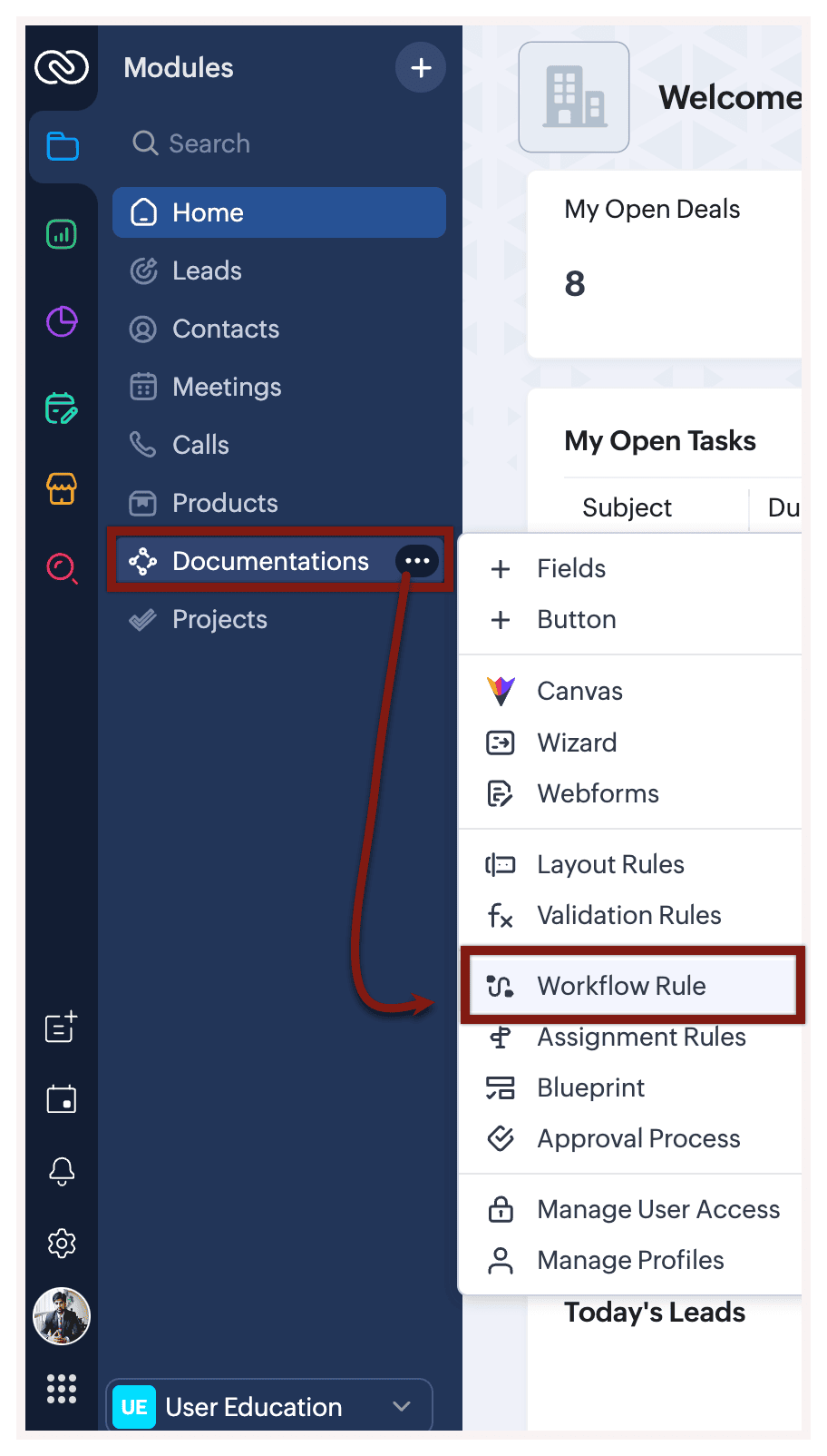 - 在 CRM主页 , 选择您希望创建工作流规则的团队模块。