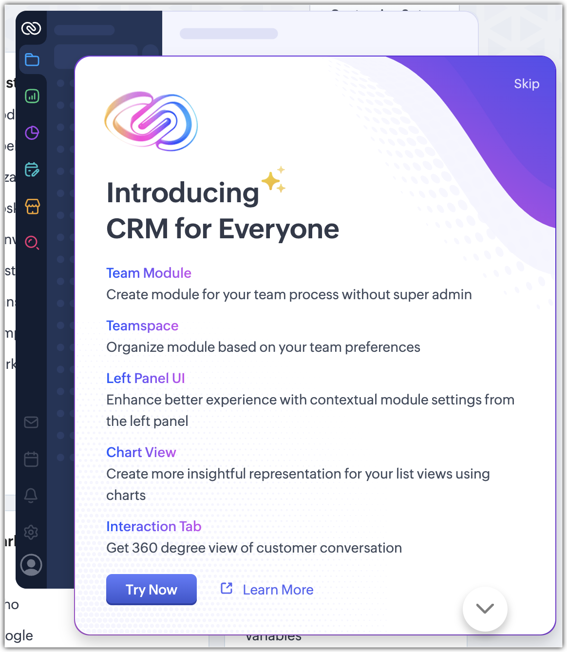 - 一旦发布更新横幅,您可以点击立即尝试启用Zoho CRM全员版。