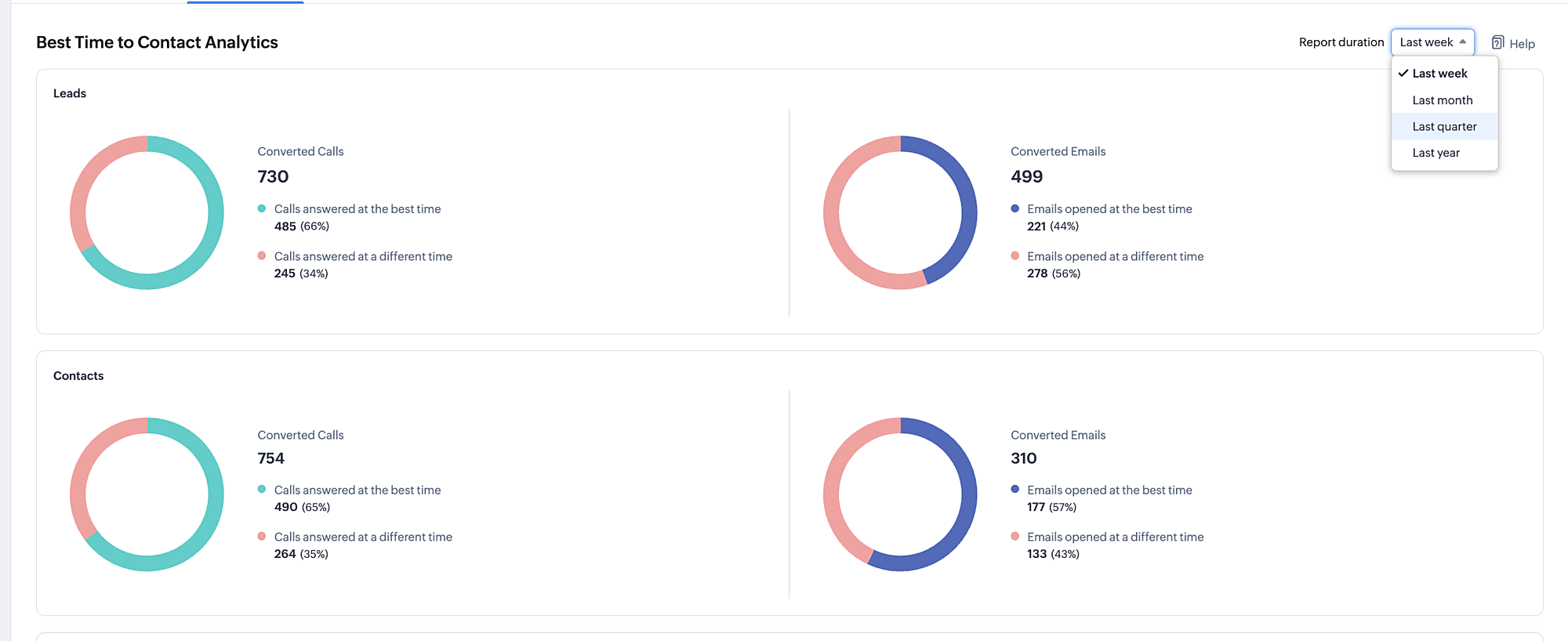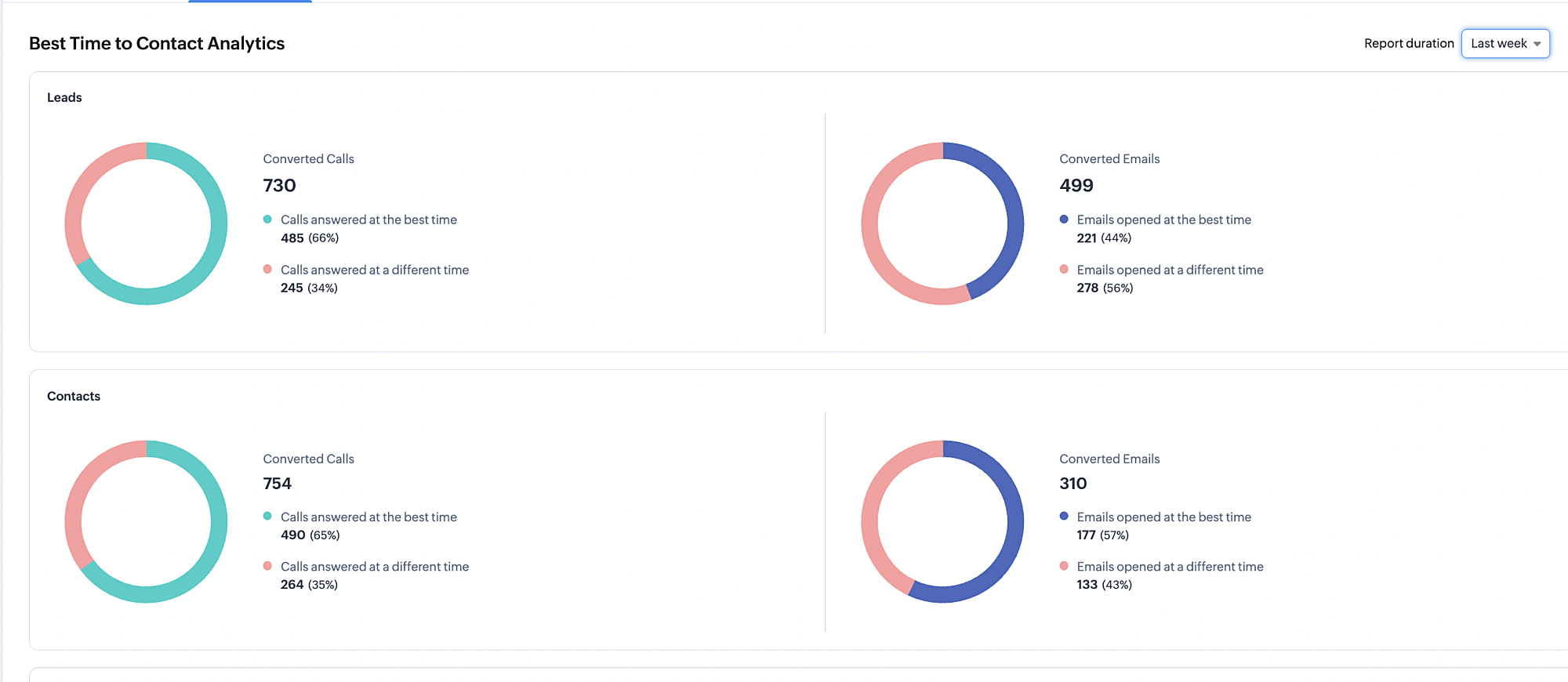 最佳联系时间总结会分别显示您的线索和联系人模块的见解。