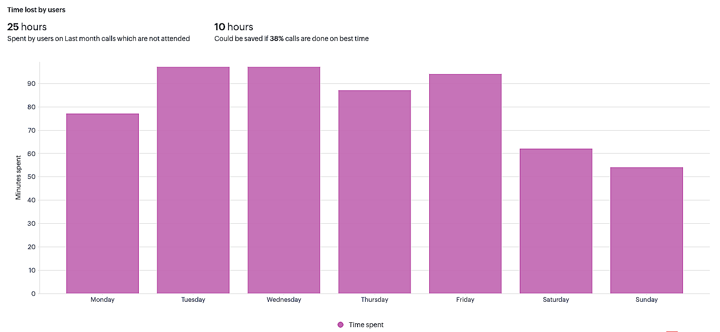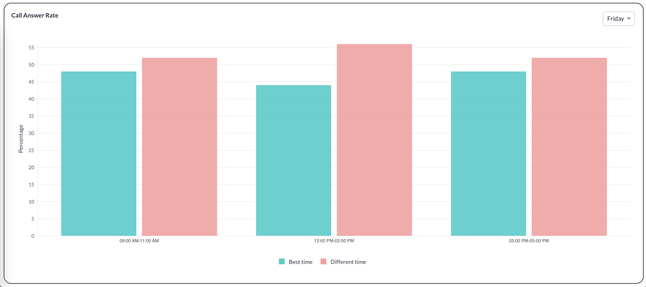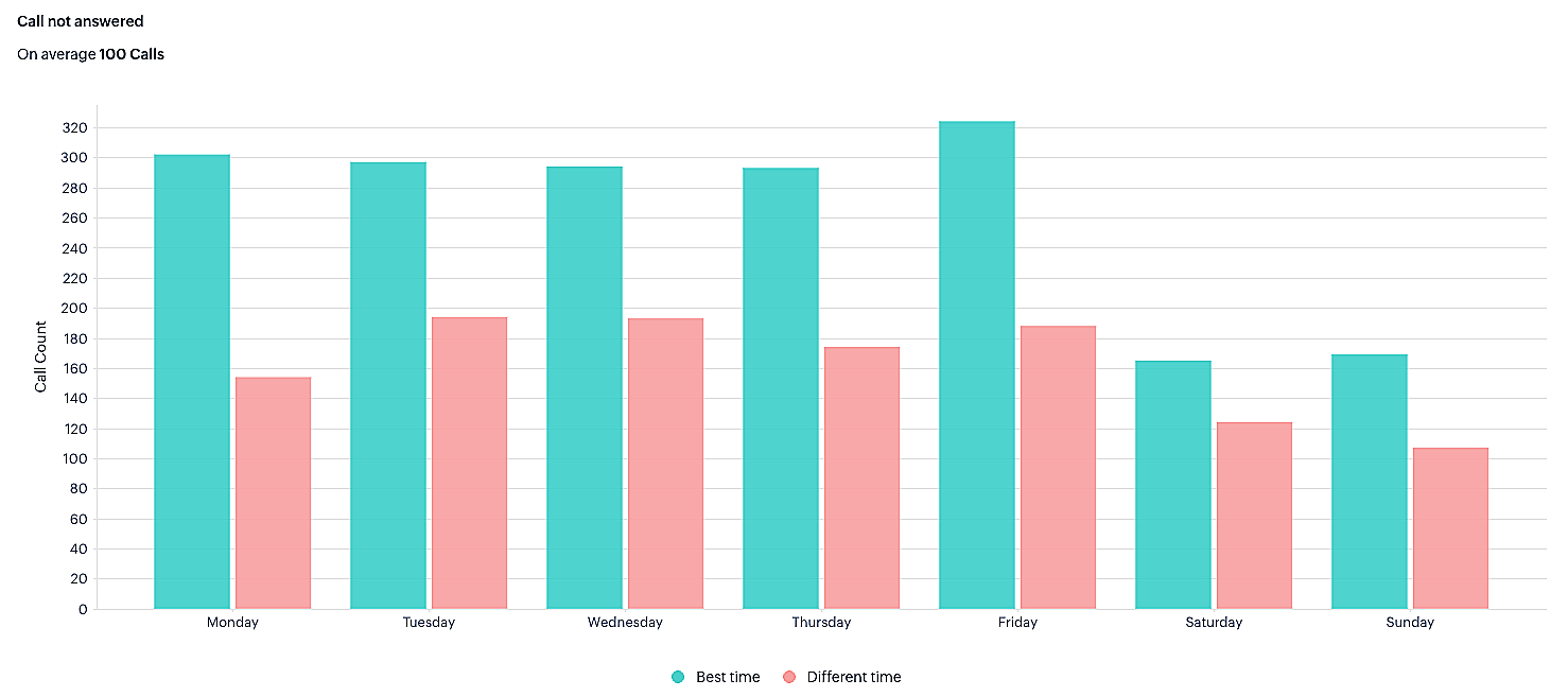 通话应答率是在最佳时间拨打的通话百分比与在不同时间拨打的通话百分比之间进行探索的。这是一个视觉提示,可以帮助您评估一周内的反应速度。 在下面的图片中,您可以理解在星期五的最佳时间打的电话不如在其他日子打的电话好。 同样,您可以从这张图表中看到详细的见解。