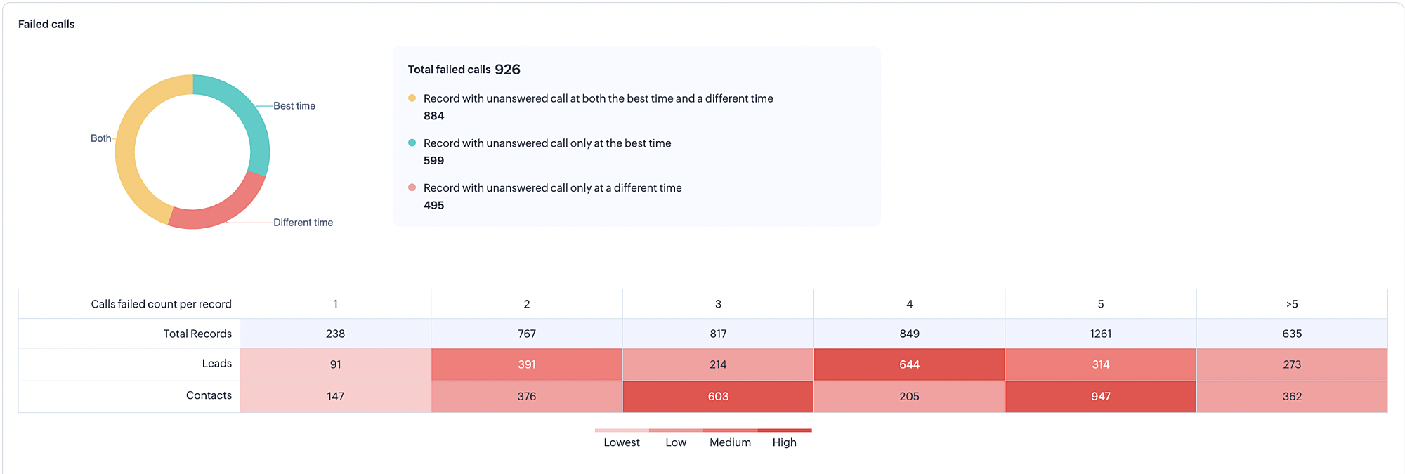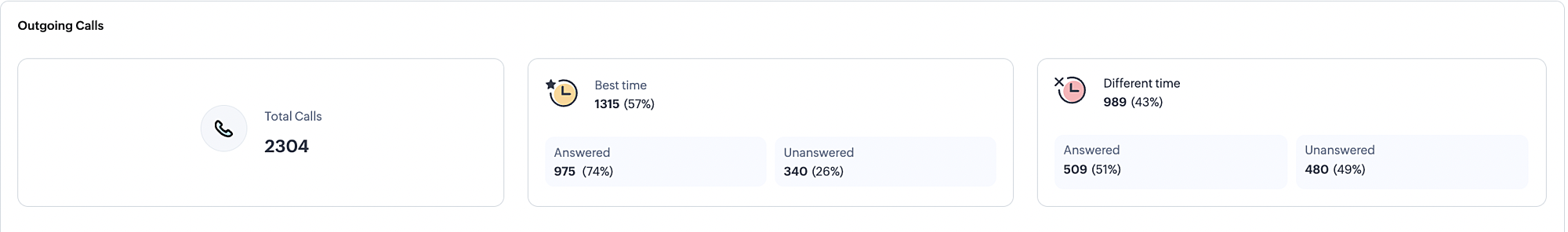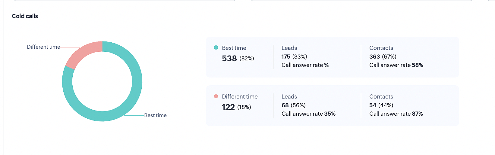 第一次打给线索或联系人的电话被归类为陌生电话。这些电话给您的企业留下了第一印象,并提供了与他们扩大业务的绝佳机会。如果电话没有被接听,您可以检查陌生电话指标,看看是否根据建议的最佳时间到达线索或联系人。