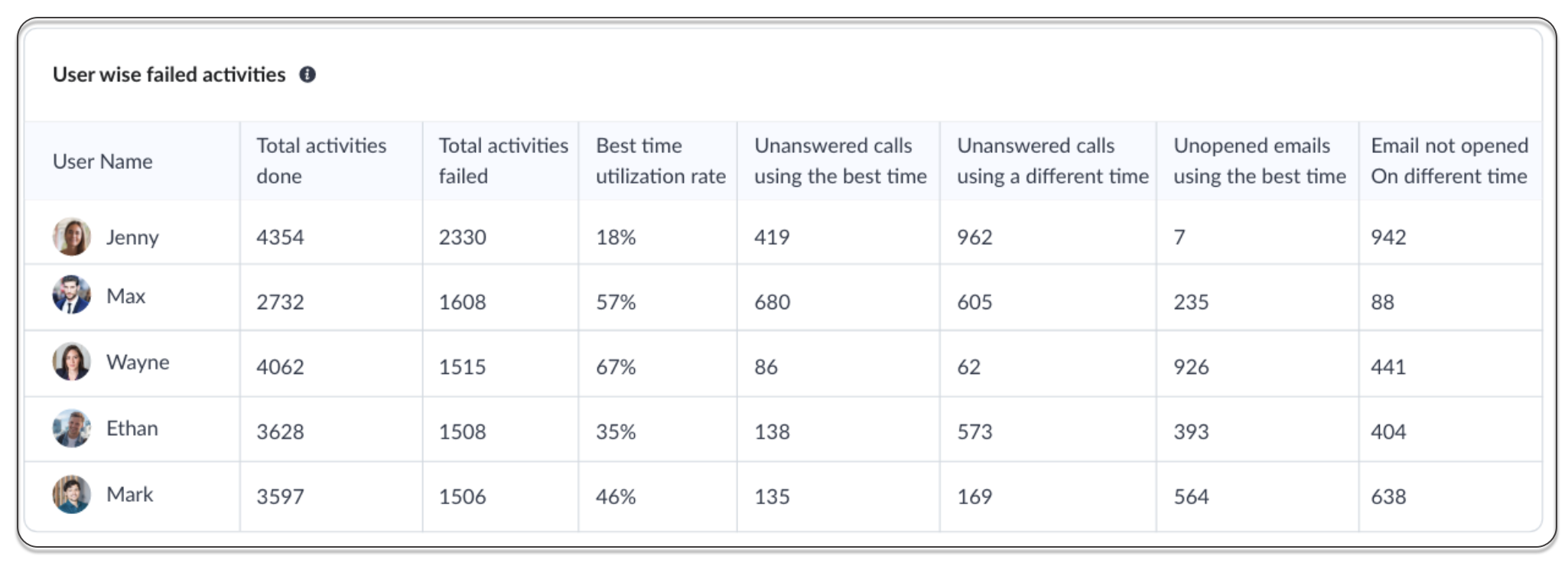 作为一名管理人员,您可以查看销售过程中的低转化率,销售经理可以评估最佳联系时间的分析,并查看即使在多次给潜在客户拨打电话和电子邮件等之后也没有转换的潜在原因。