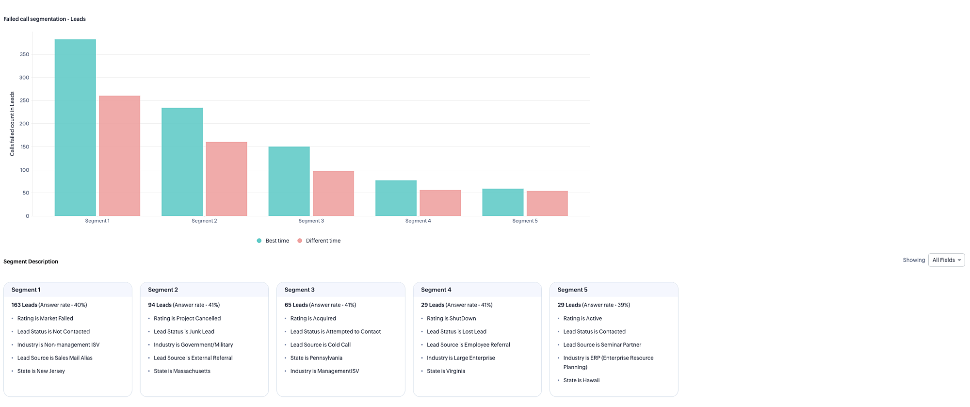 Zia 将在最佳联系时间分析下对失败的活动进行细分。 这将有助于管理者了解整个细分的特点和独特因素,并得出较低转化率的原因。 在每个细分下,将列出每个细分的失败通话/电子邮件计数和条件。 还将进一步隔离失败电话或电子邮件,以及这些活动是在建议的最佳时间还是在其它时间完成的。