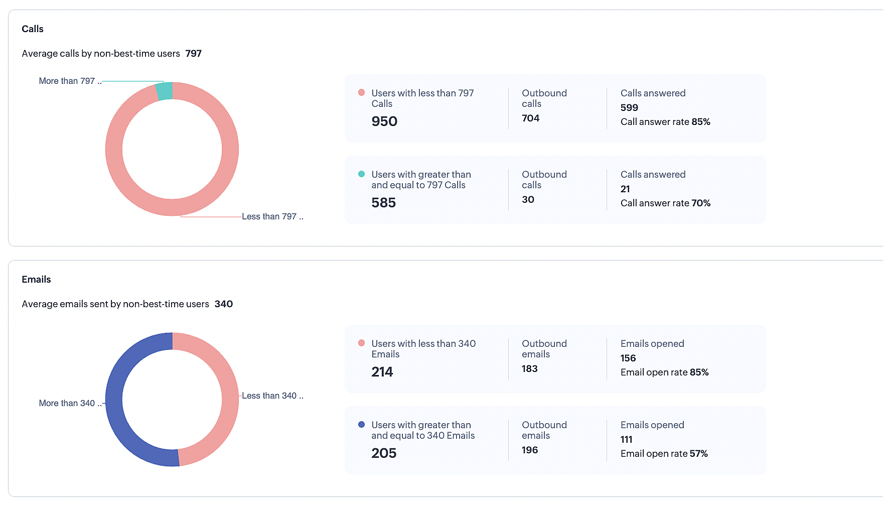 此外,在圆环图的帮助下,Zia表示了在最佳时间和不同时间发送的电话和电子邮件的百分比。通过这种一对一的比较,您可以评估哪些对您在最佳时间进行的业务通信有益,哪些对在不同时间进行的业务通信有益。