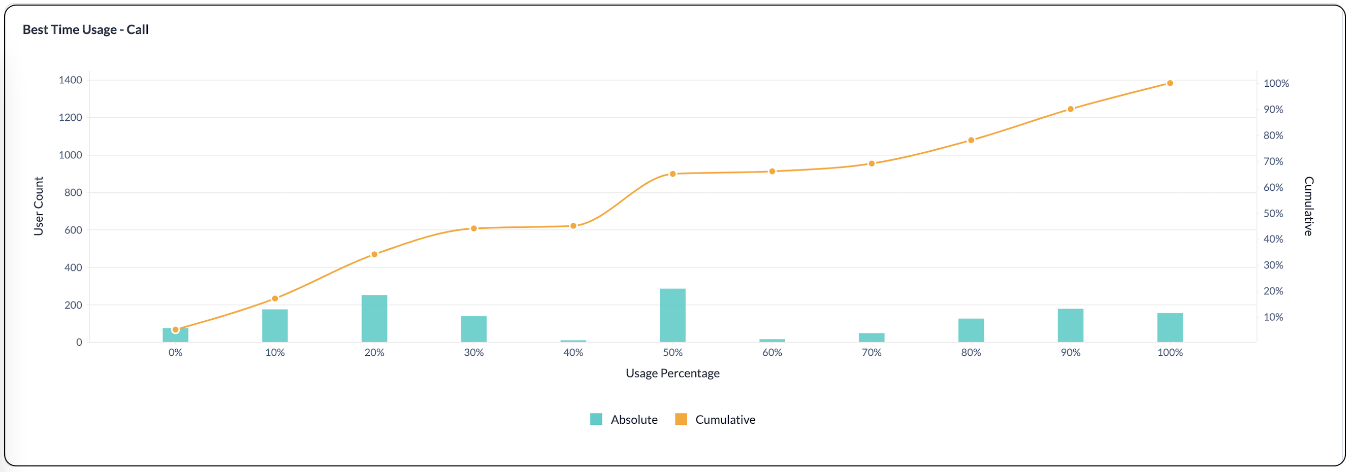 通话使用图表显示了使用最佳时间建议的用户数量的使用百分比。 从下图中,您可以推断出大约50%的用户,也就是大约300人使用了这些建议。 这是绝对值。 然而,累积起来,大约有200个用户在70%的时间里使用了这些建议。