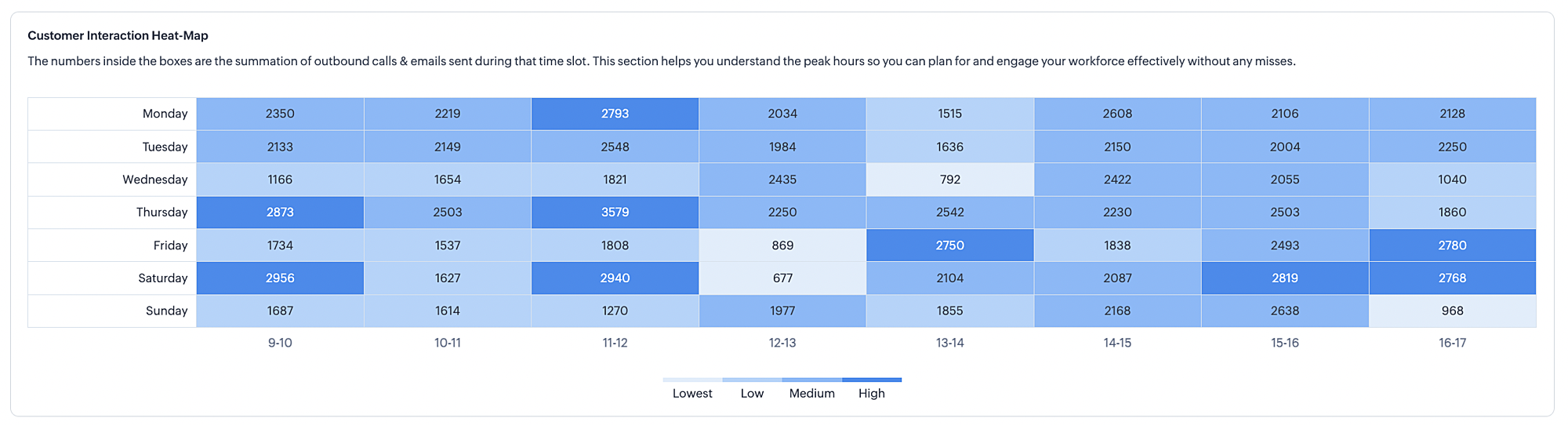 交互热图是一个动态图表,显示一天中发送的电子邮件和电话数量最多的时间。 这是一份每周时刻表,显示每天的高峰时间。 根据地图,您可以评估销售代表在一天或一周中的什么时候进行对外通信,并评估和计划他们的生产力。