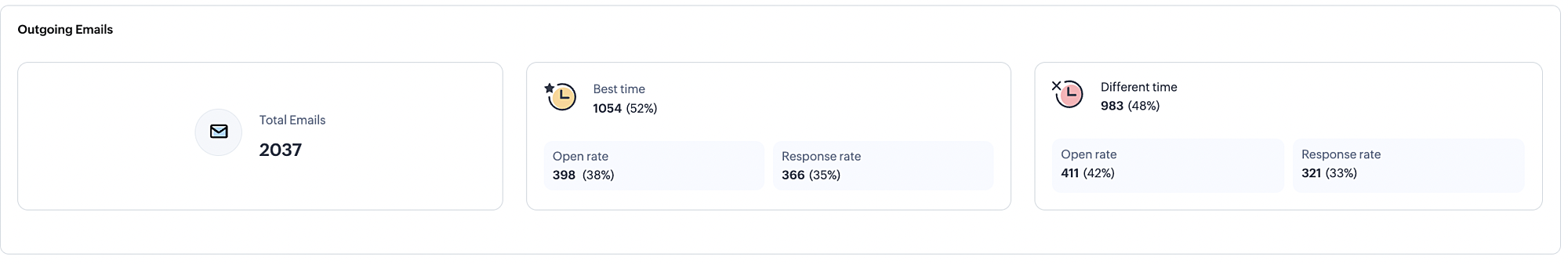 外发邮件分析可以让您评估总共发送了多少封外发邮件,以及其中有多少封是在最佳时间发送的,有多少封是在之外不同时间发送的。 显示的关键绩效指标如下: