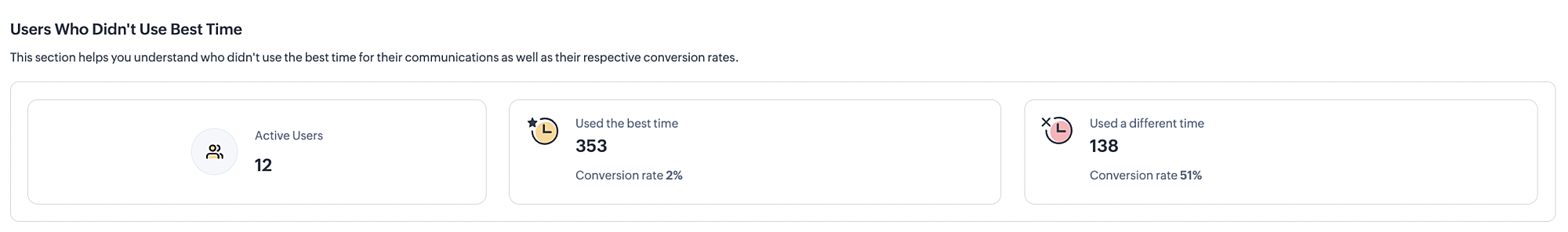 此外,Zia允许您调查没有使用建议的最佳时间的用户的转化率。 它显示了这些用户的电话和电子邮件的做法,并让您比较他们的指标。