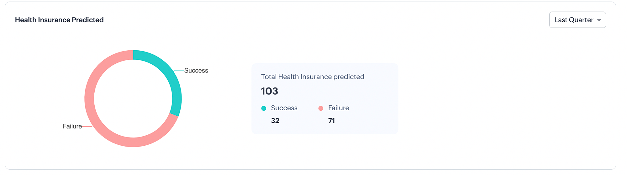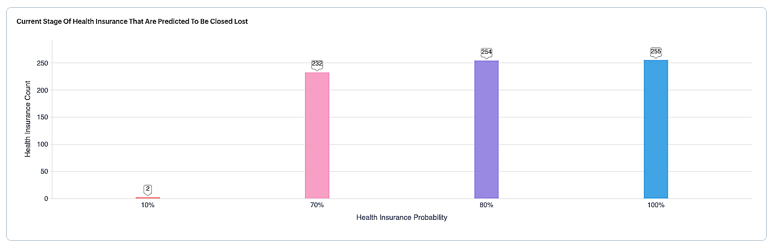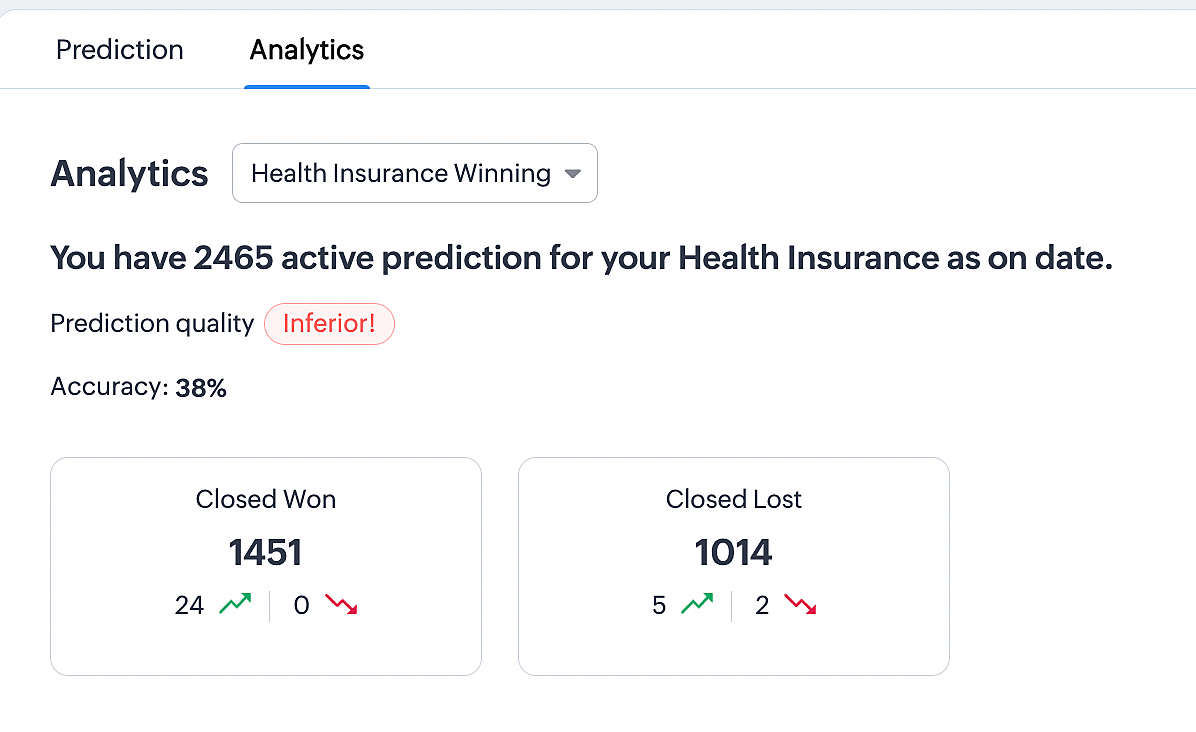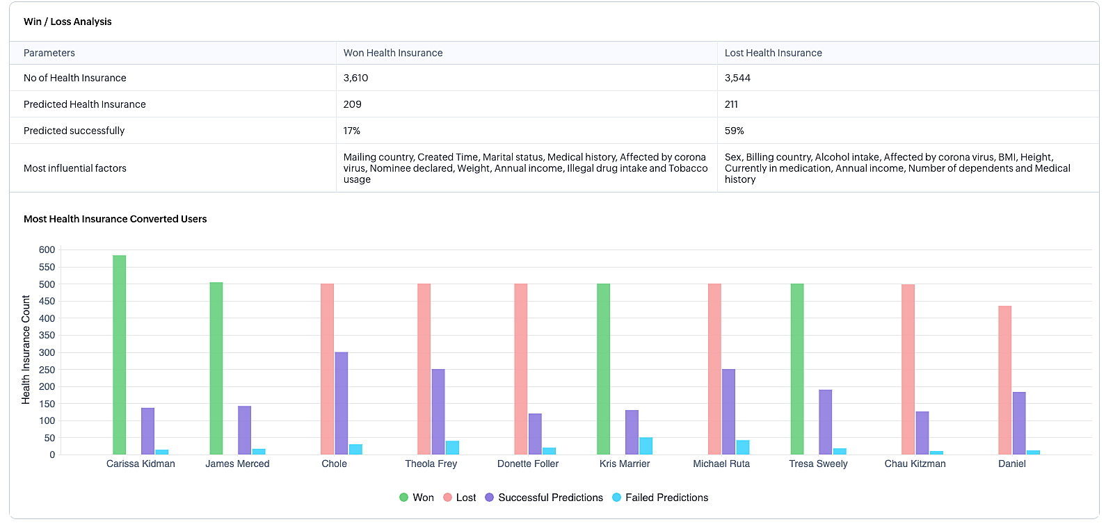 Zia预测将提供输赢分析,考虑到进入预测的数字,以及系统帮助预测输赢的效率,除此之外,它还列出了到达此分析的最具影响力的因素。 例如,以一家健康保险公司为例,他们的赢/输分析是这样的。在这里,您可以获得销售代表赢得和失败的总体健康保险政策、预测的数量、预测的成功率和失败率,以及相同数据的图形表示。