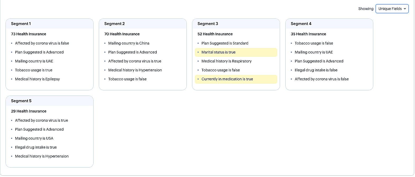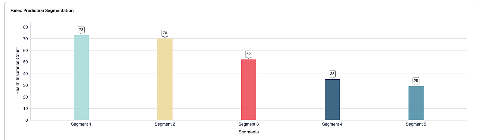 Zia 将细分先前失败的预测,并验证它们,这些信息可用于理解不同细分必须达到失败模式的共同特征。它将根据不同的字段将失败的预测细分。您可以过滤以查看唯一字段,它们将像这样突出显示: