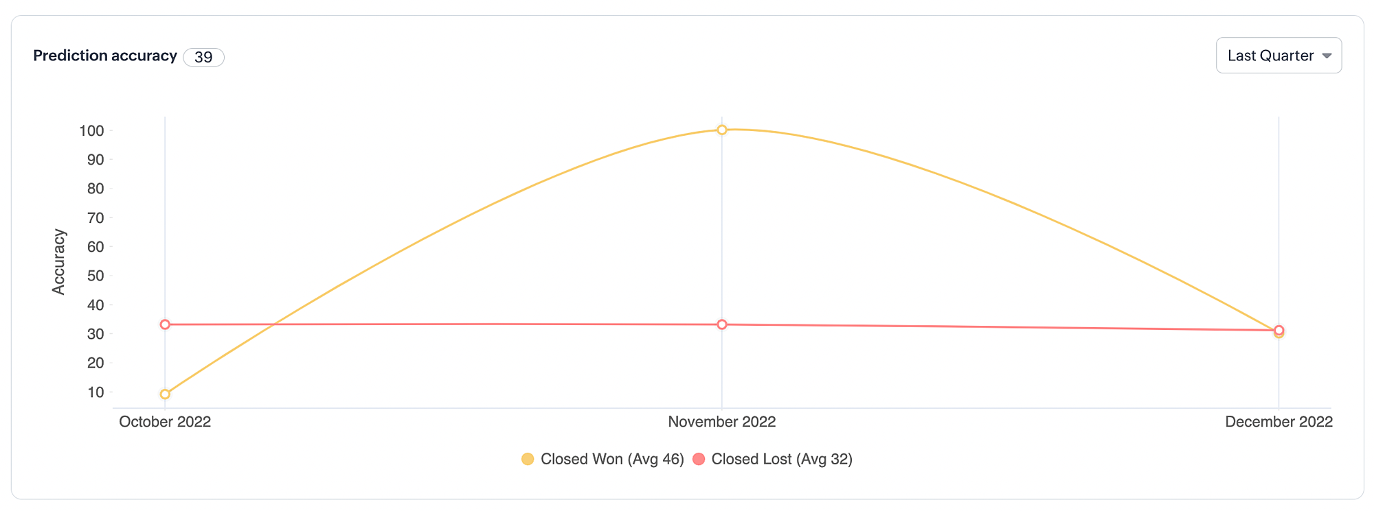 您可以看到上周、上月、季度等做出的准确预测的数量。您还可以查看预测成功和失败的数量,这是通过评估实际字段值与最终状态的预测字段值来计算的。 例如,预测成交的商机数量与实际成交的商机数量。 如下图所示,32个商机被准确预测。