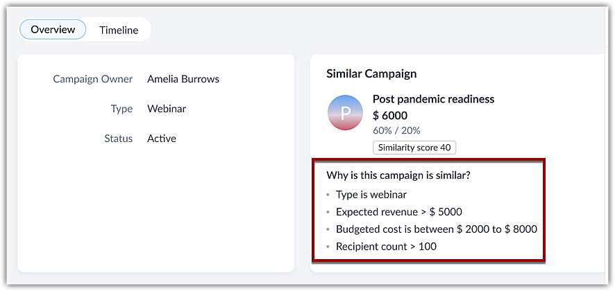 与客户详细信息一起,它还将显示用于识别相似性的因素,例如兴趣、人口统计、地理位置或他们所属的行业。例如,下面的图像显示了“后疫情准备”市场活动相似的原因:市场活动类型、预期产生的收入、收件人数量等。