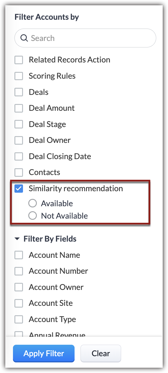 一旦您启用了相似性推荐,Zia 将添加一个系统定义的过滤器,称为“相似性推荐”,到相关模块的高级过滤器中。例如,如果为客户模块配置了相似性推荐,则相似性推荐过滤器将添加到客户模块中。