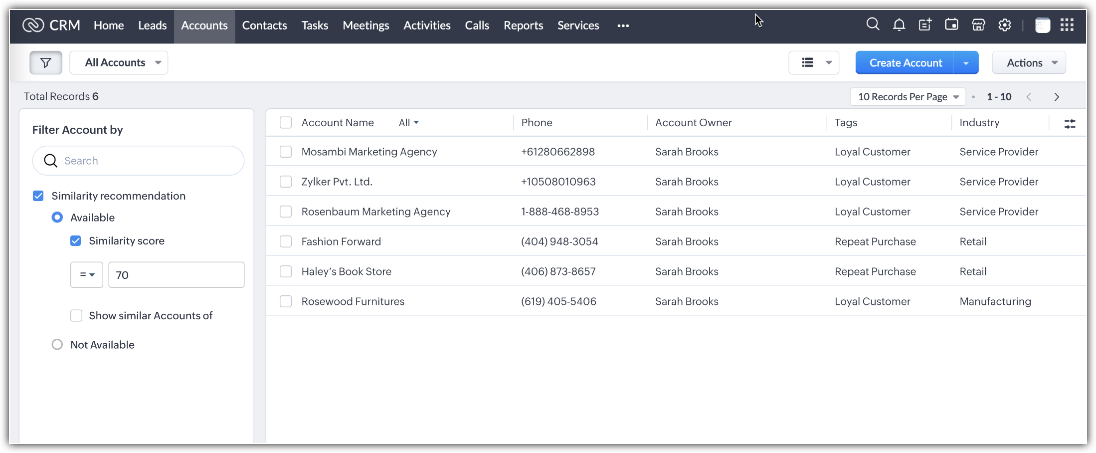 客户在电子邮件往来中提及竞争对手,往往是丢失商机的一个信号。借助 Zia 的相似性推荐,您可以监控可能最终会流失的客户,并主动跟踪和优化针对他们的沟通活动。