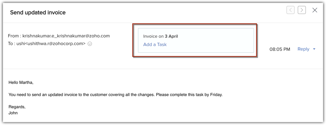 Zia 可以识别并找到电子邮件中提到的活动,并建议销售人员从电子邮件中将活动添加到 CRM。他们可以编辑建议并输入更多详细信息,也可以按原样保存活动。Zia 的建议可以在记录的相关列表以及销售信号中的电子邮件中看到。