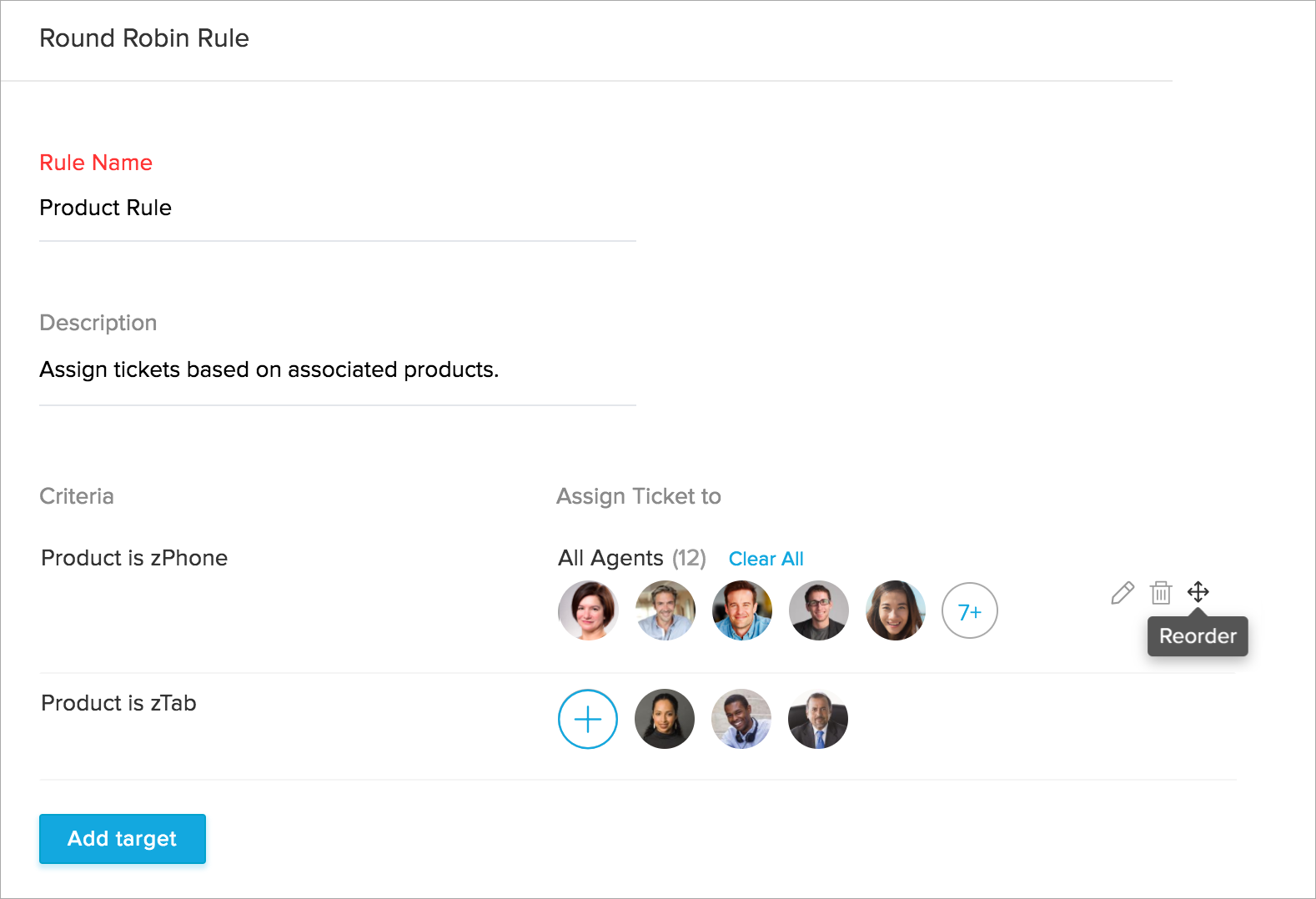 一个新的循环分配规则已创建。您可以点击客服人员的头像 ( X )以将他们自对象内移除。另外,通过点击其旁边的删除图标 (