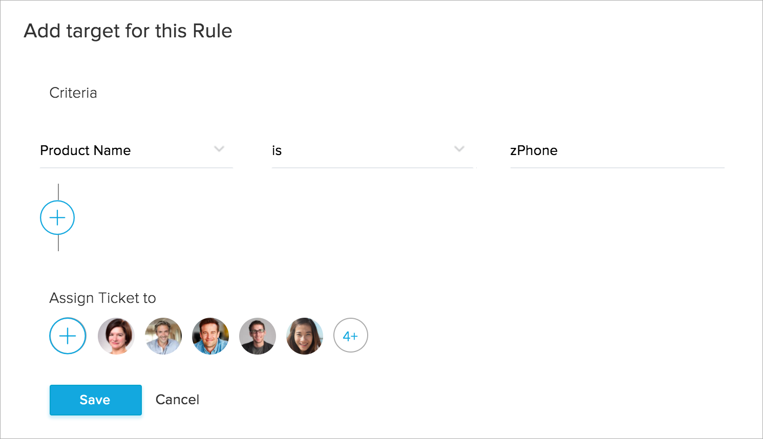 - 指定应该分配工单的客服人员列表。您可以选择以下选项之一点击添加客服人员图标 (