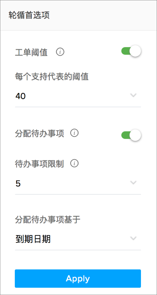 您可以设置循环分配规则的首选项如每位客服人员的工单限制、积压工单的分配等。
