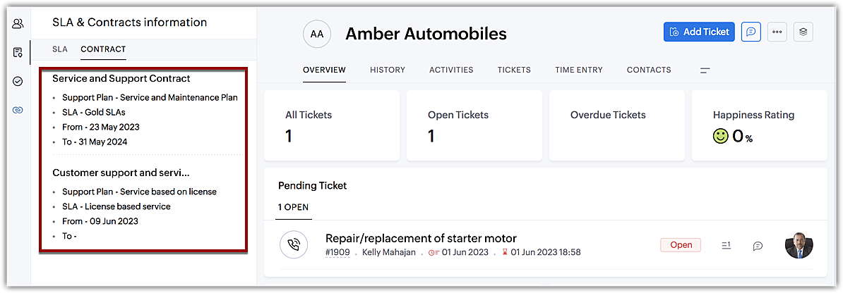 在下面的示例中,Amber汽车与两个合同和技术支持计划相关联。 每个合同的T&C各不相同,技术支持计划也不相同。 服务和支持合同在有限的时间内有效,而客户支持和服务没有结束日期。
