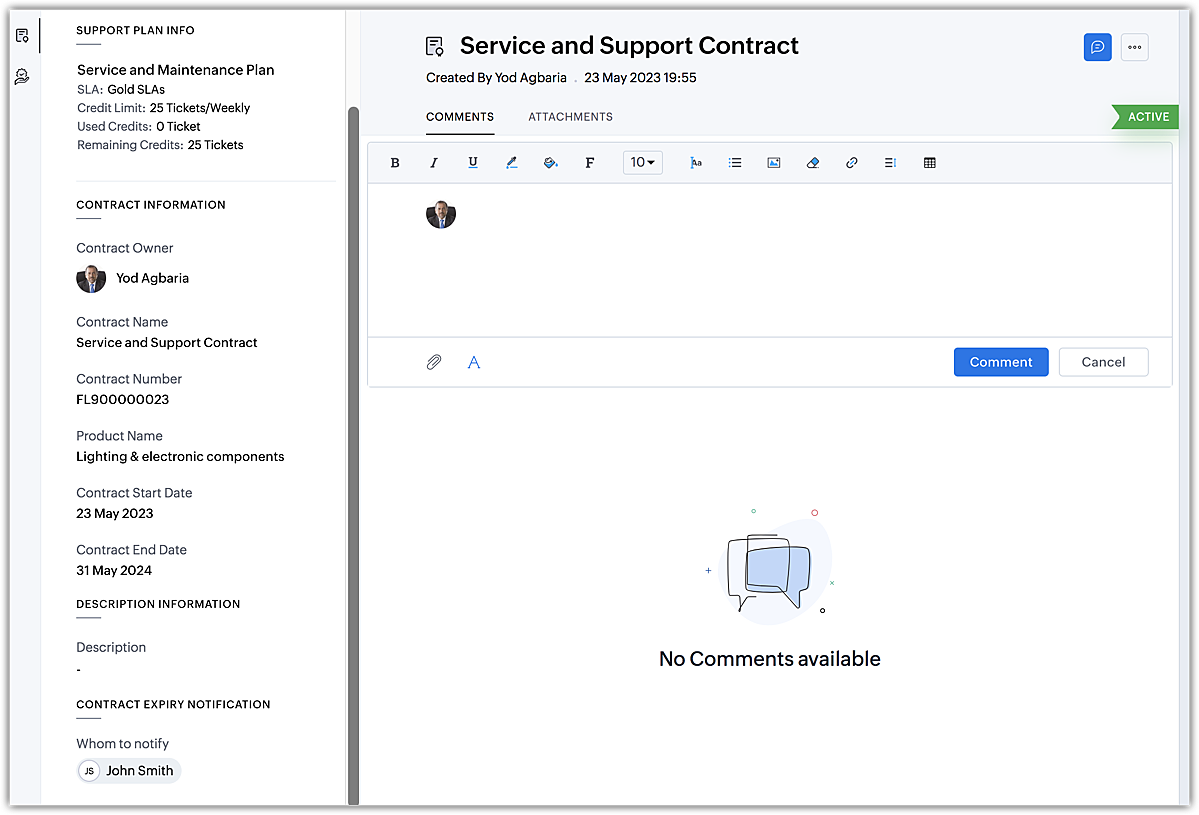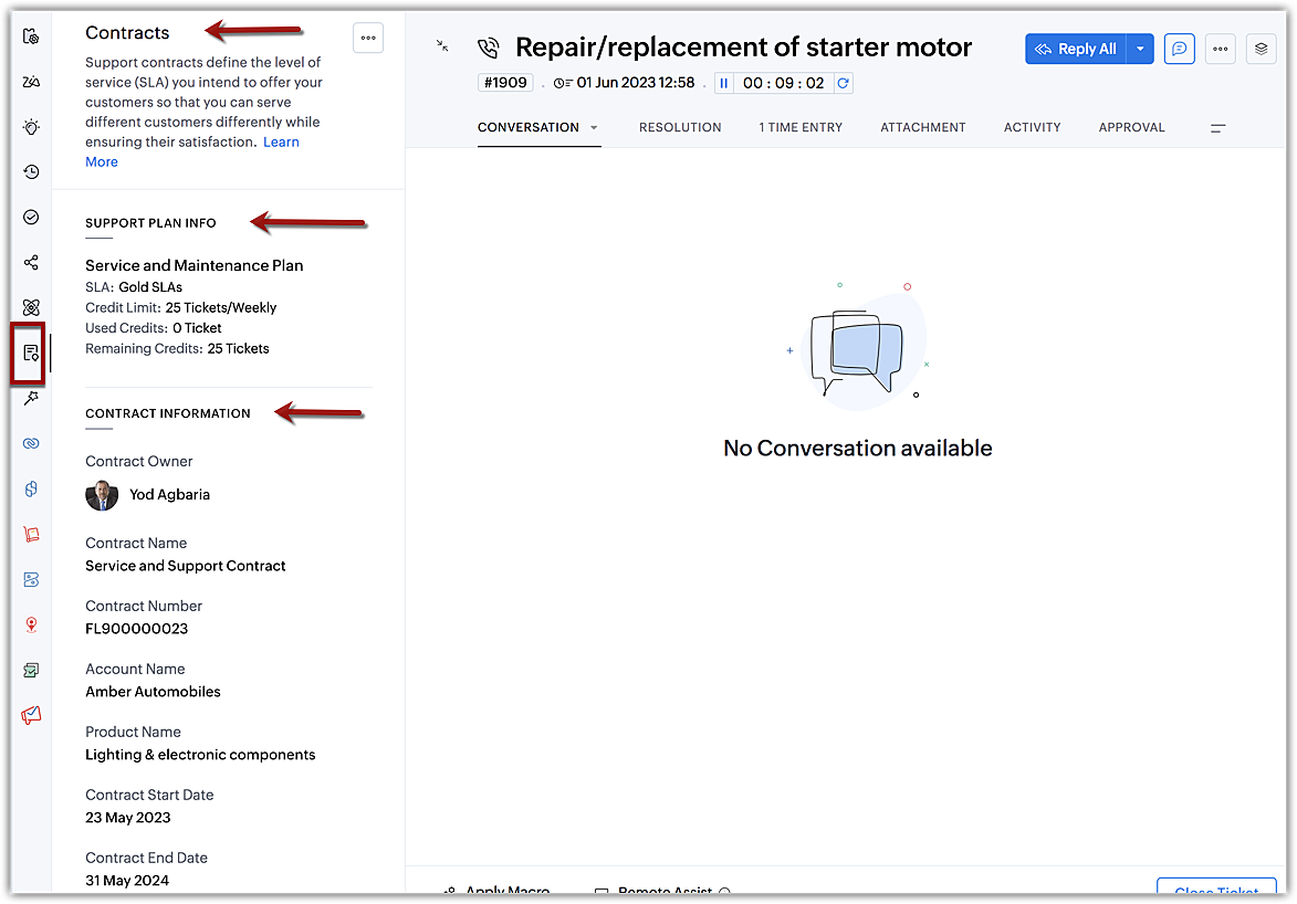 当提交一个工单后,在详细页面中,通过单击左侧面板上的合同图标,将显示有关该合同和相应工单所遵循的技术支持计划的详细信息。 客服人员可以查看合同有效期和客户的信用点数余额。