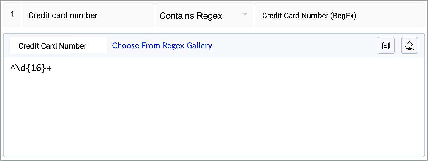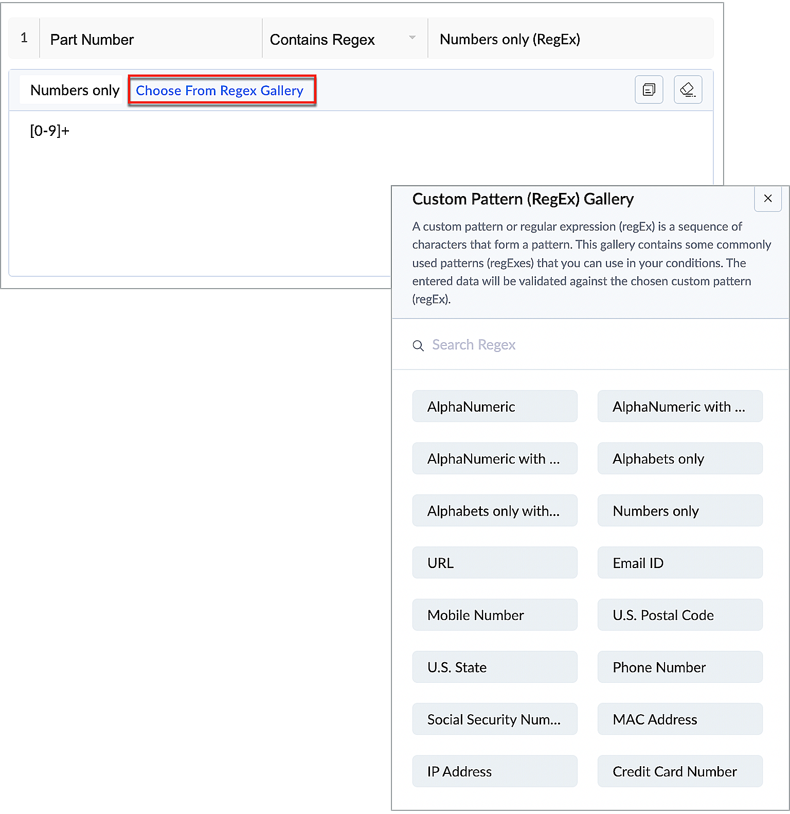 除了在定义布局/验证规则中的条件时创建正则表达式模式外,还有一个选项可以从正则表达式库中选择偏好的正则表达式模式。 使用regex库,您可以随时使用预定义的regex模式,而无需每次都创建模式。