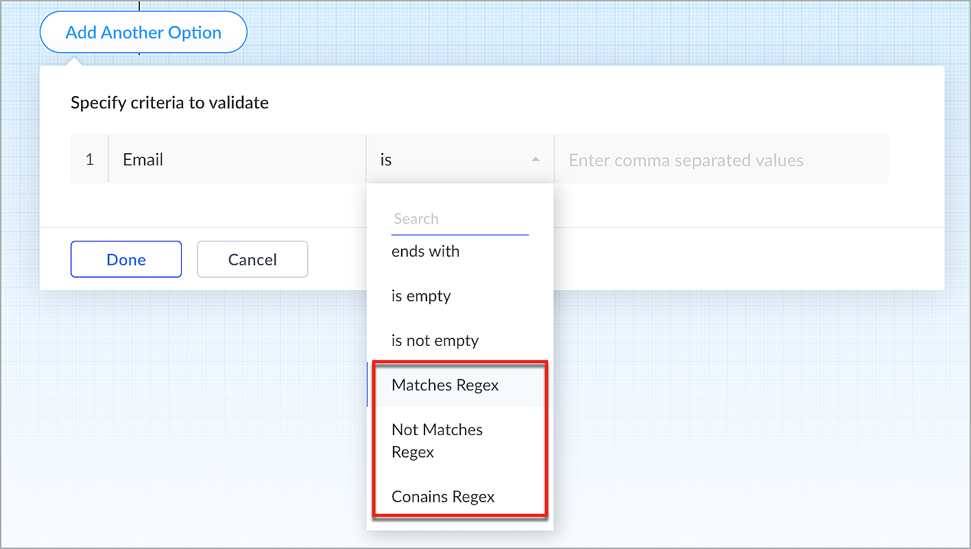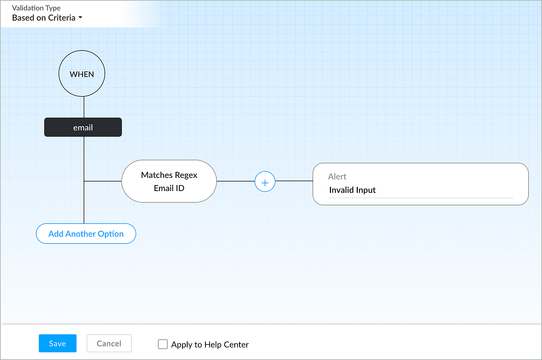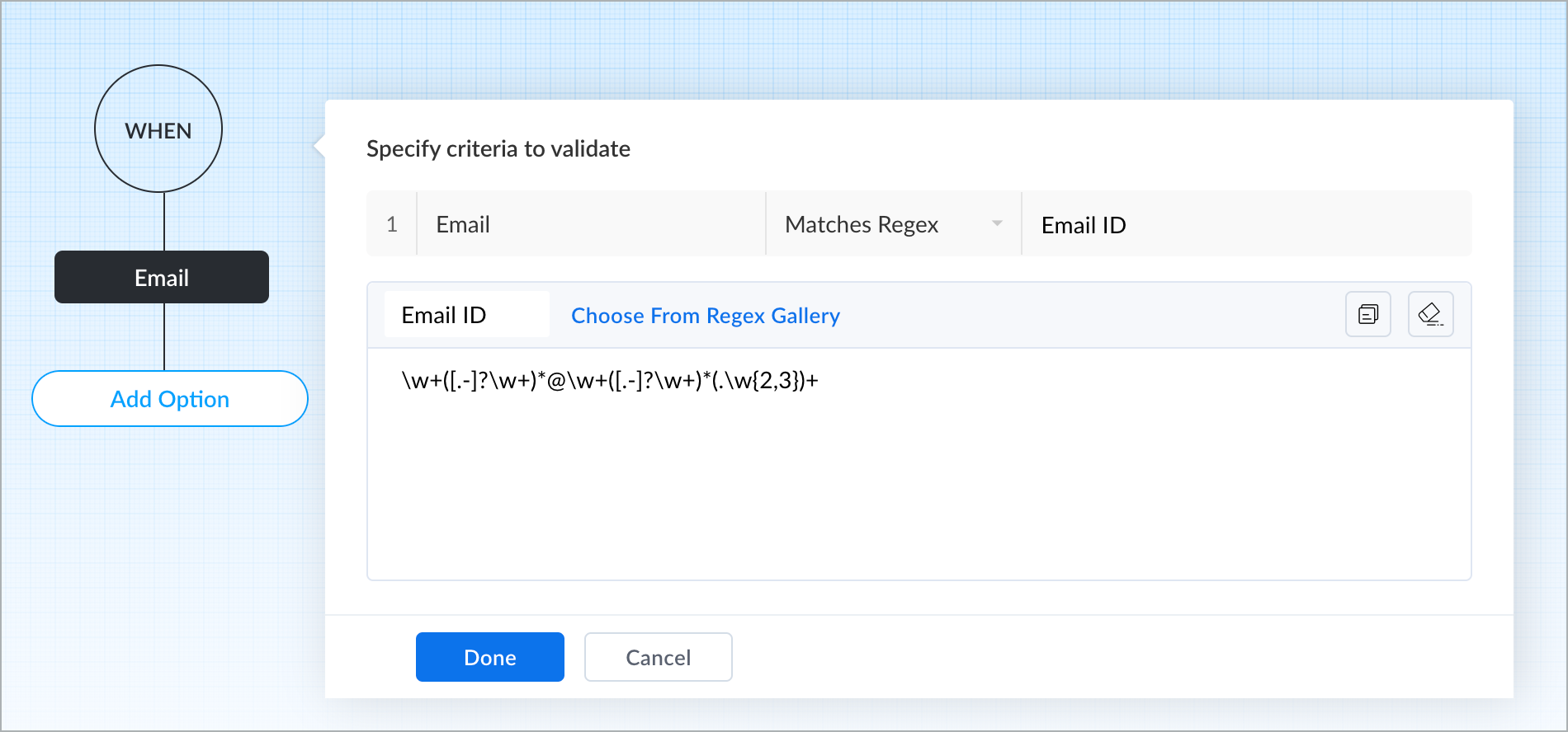 例如,假设您想要验证终端用户是否以特定格式输入电子邮件地址,例如johnsmith123@zylker.com。 在这种情况下,您可以创建一个验证规则,并定义或选择一个匹配有效电子邮件地址格式的regex模式(如电子邮件地址 + 匹配regex + 电子邮件地址)。 然后可以使用此模式检查输入的电子邮件地址是否与该格式匹配。