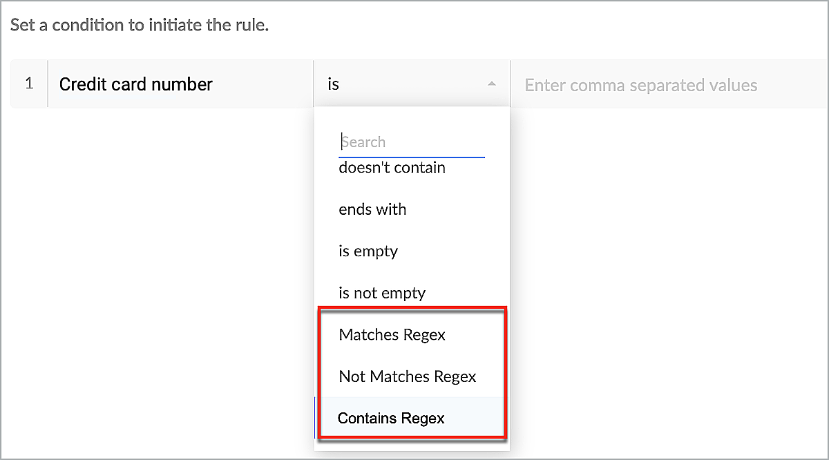 - 可以实现的功能 : 该选项允许用户识别在提供的文本中存在特定模式的实例。 考虑一个卖家列出产品的线上应用市场。 为了确保准确的运输信息,您需要识别提及美国邮政编码的产品列表。 通过使用包含Regex,您可以自动检测引用五位数格式的美国邮政编码的清单。