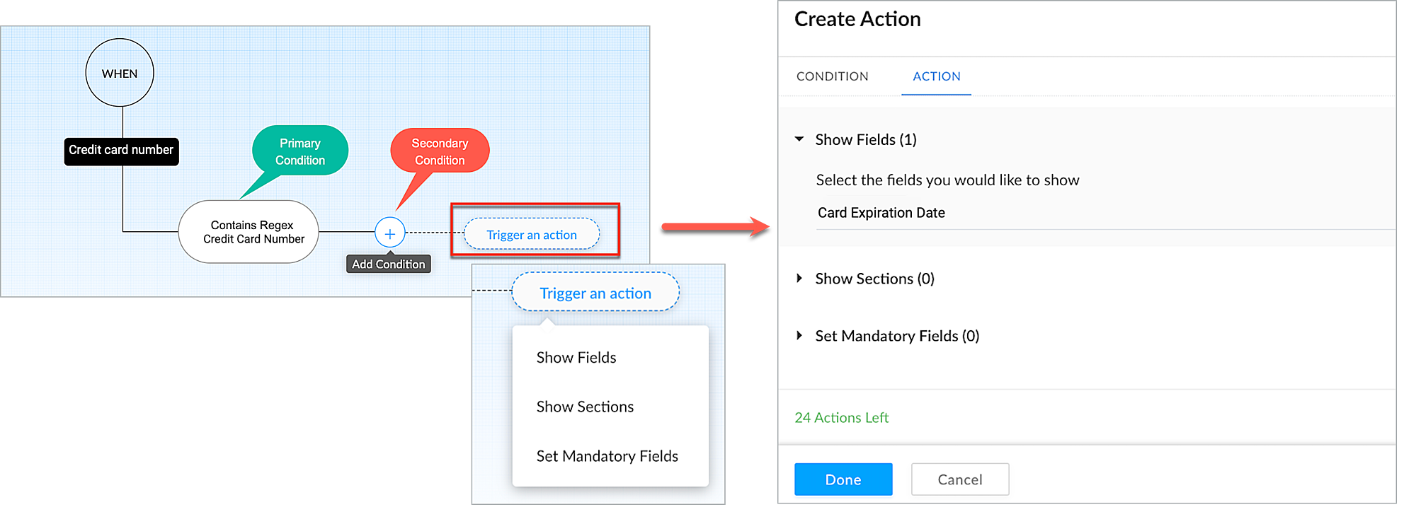 在配置布局规则时,可以在主字段上设置regex,以便在用户输入值时对其进行验证。 这在根据给定数据的格式确定布局行为时非常有用,并且消除了创建多个条件的必要。