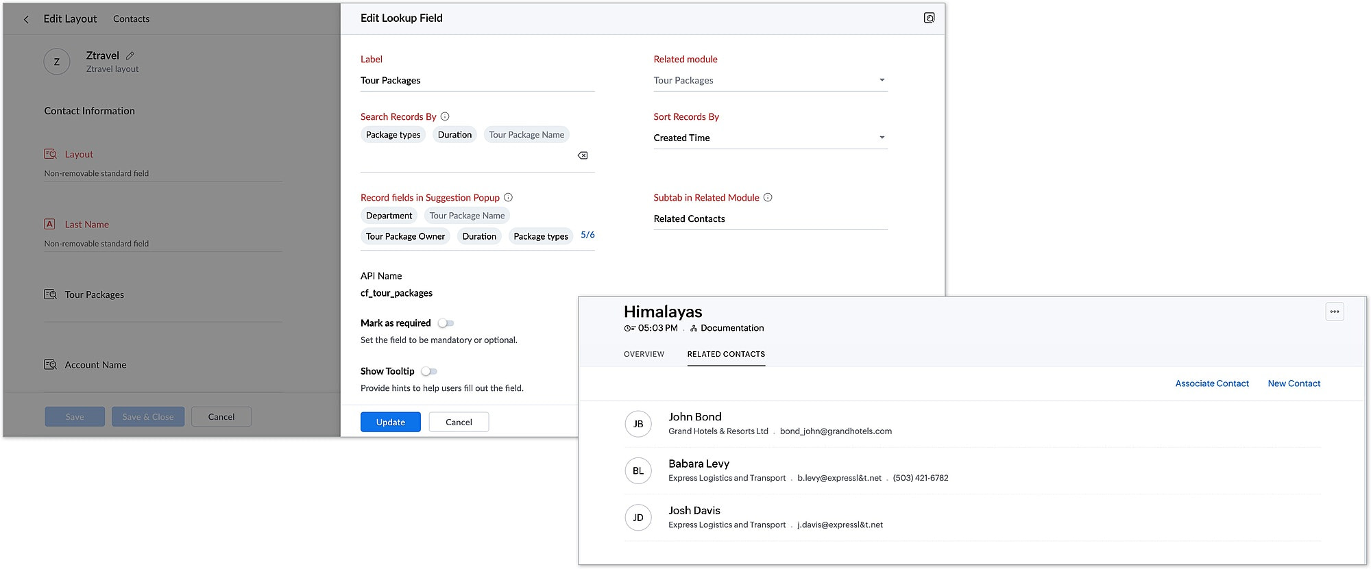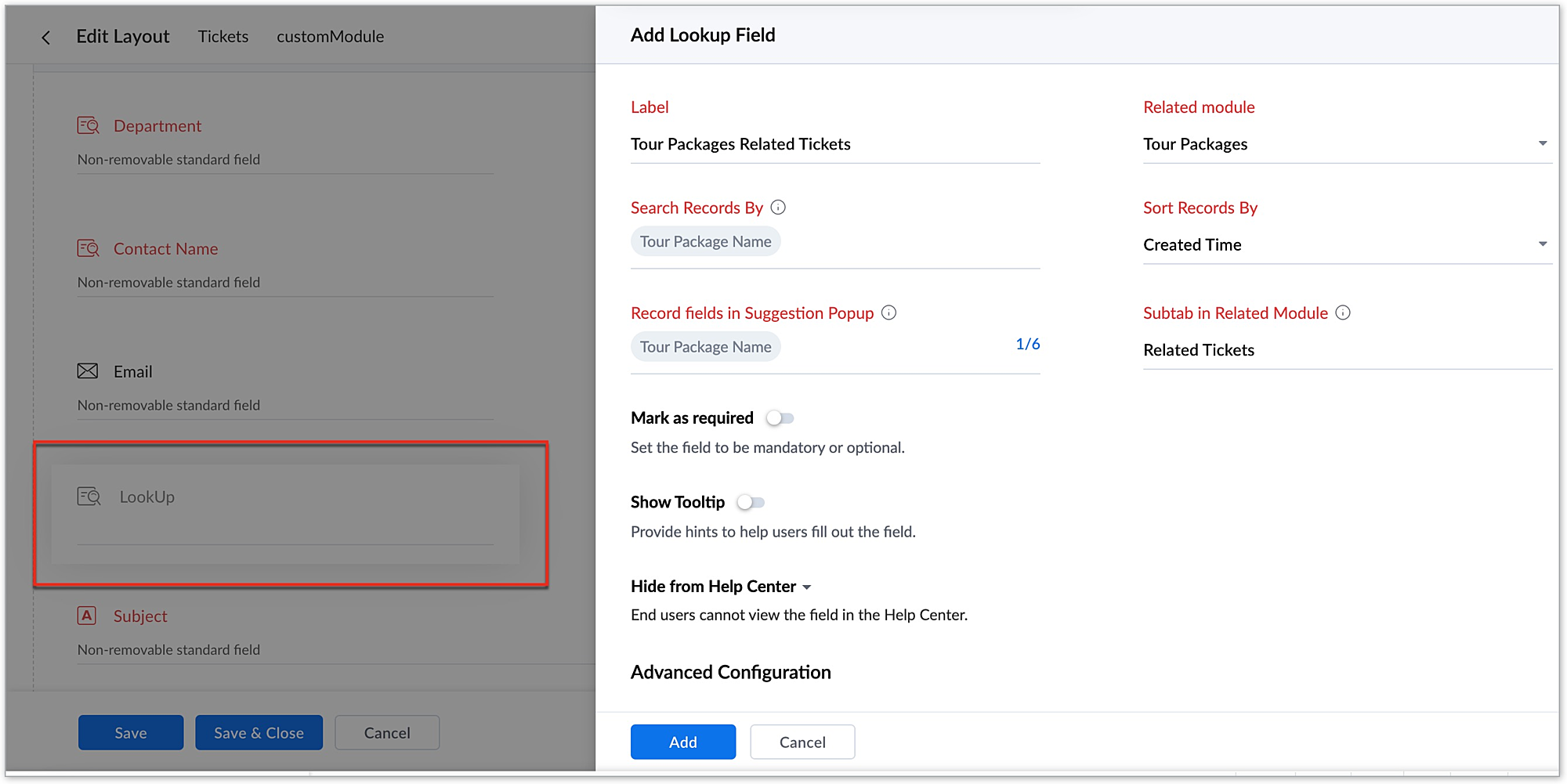 例如,旅游套餐可以与标准模块工单 相链接。 这将允许旅行社从二者中的任意一个模块访问和查看记录。 为了建立这样的关系,管理员可以在工单布局中创建一个自定义查找字段。