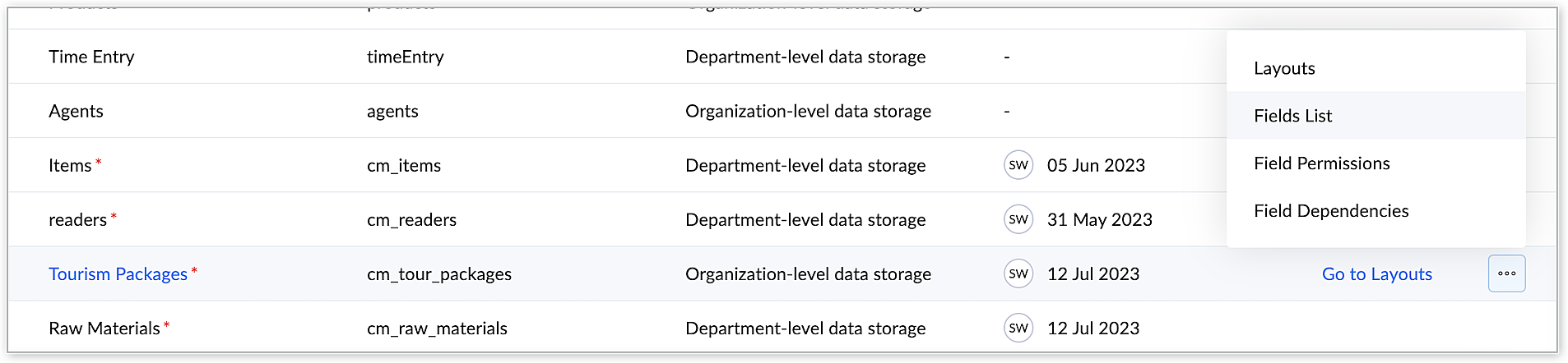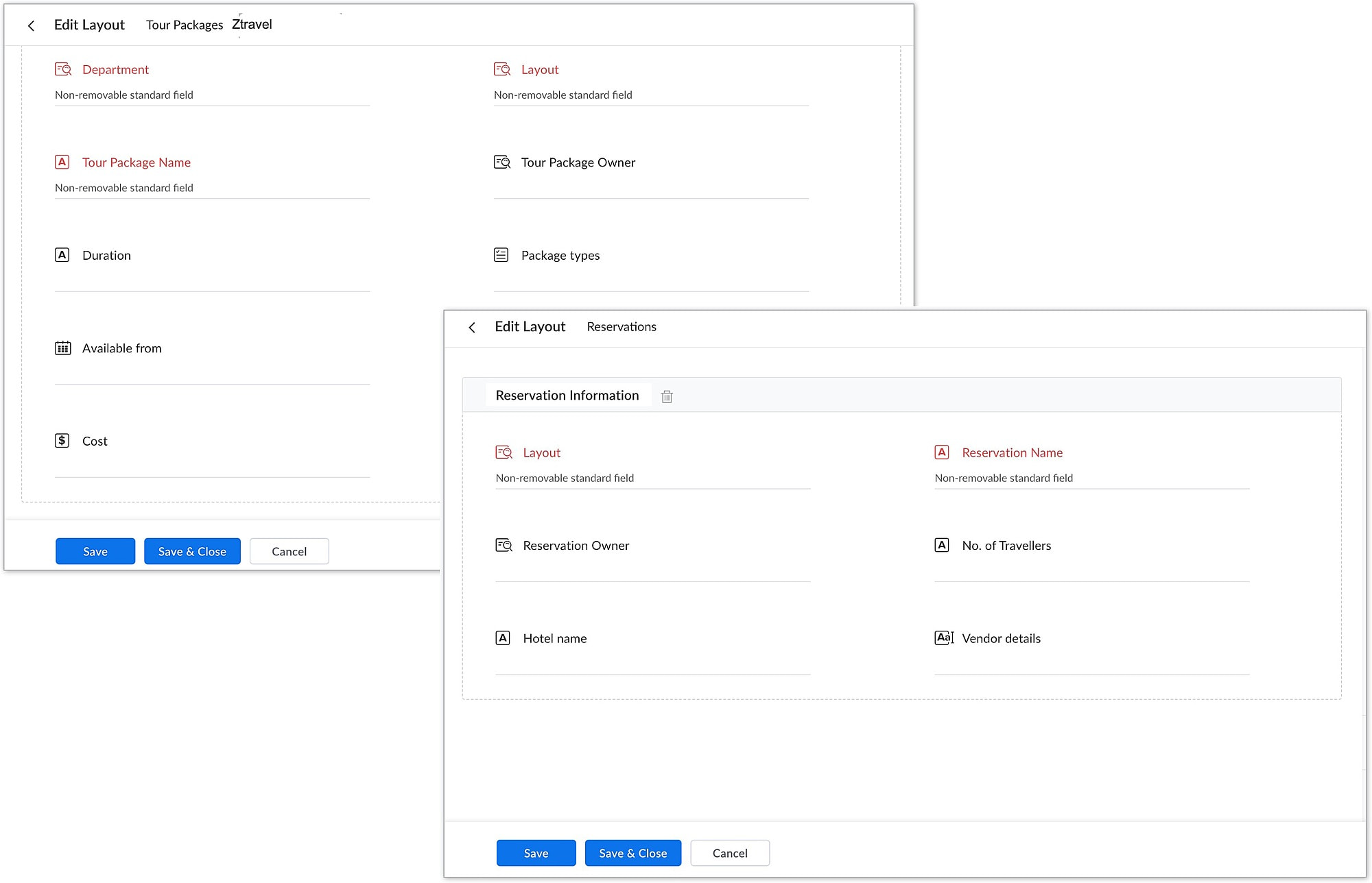 跨部门创建通用标准布局。 在“旅游套餐”自定义模块中,存储了一组公共记录,并在整个组织中反映出来。 因此,将使用一个标准布局。