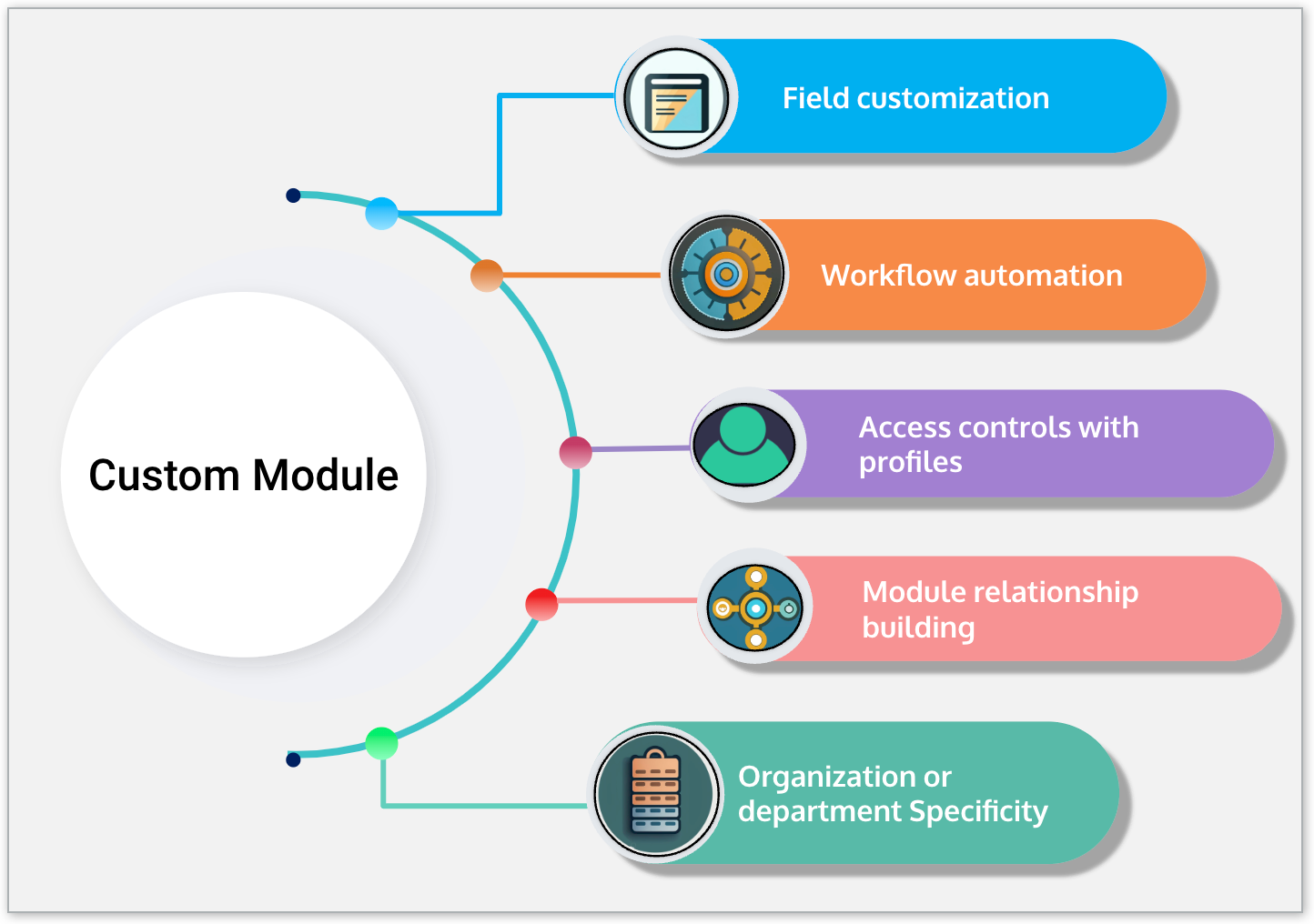 有时,标准模块可能无法满足所有业务需求,在这种情况下,自定义模块可以帮助企业解决其精确需求。 例如,客户、产品或知识库等模块可能不适合教育部门。 他们可以创建自定义模块,如“学生”、“教授”和“辅导员”,这些模块将与他们的操作过程保持一致。