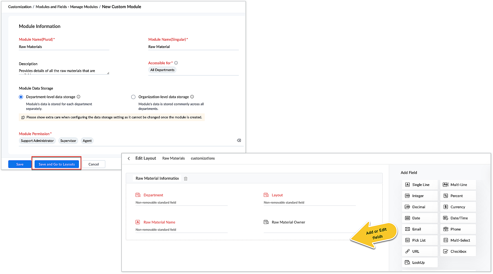 自定义模块中的标准字段将在所有部门的布局中可用。 管理员可以根据自己的需求创建和定制字段。