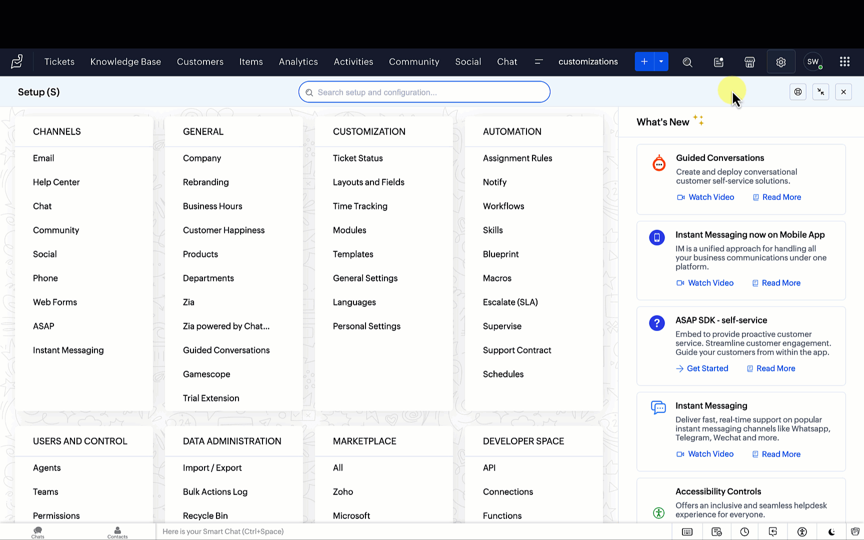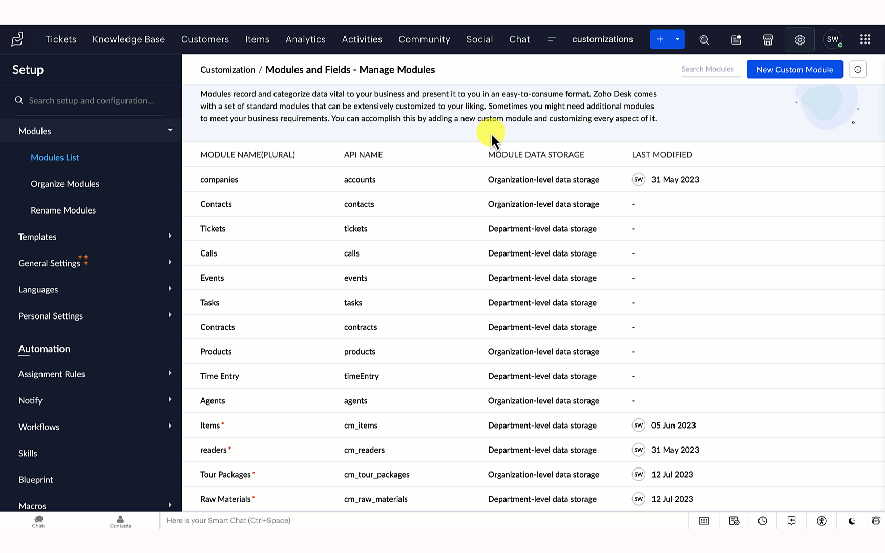 Zoho Desk管理员可以创建和配置自定义模块。创建自定义模块涉及到以下步骤 :