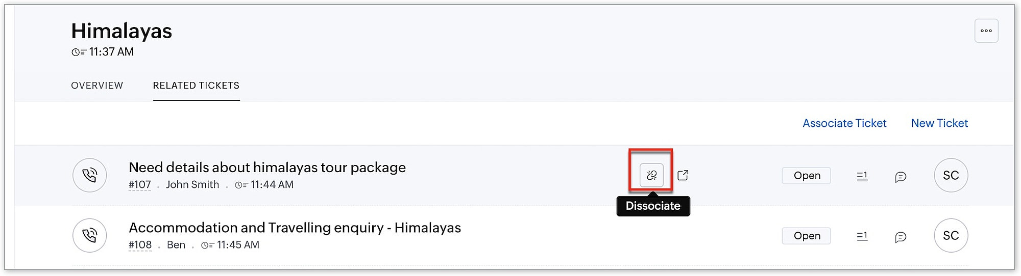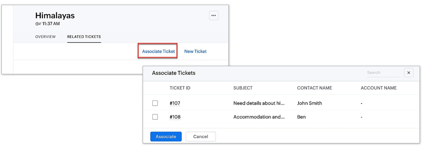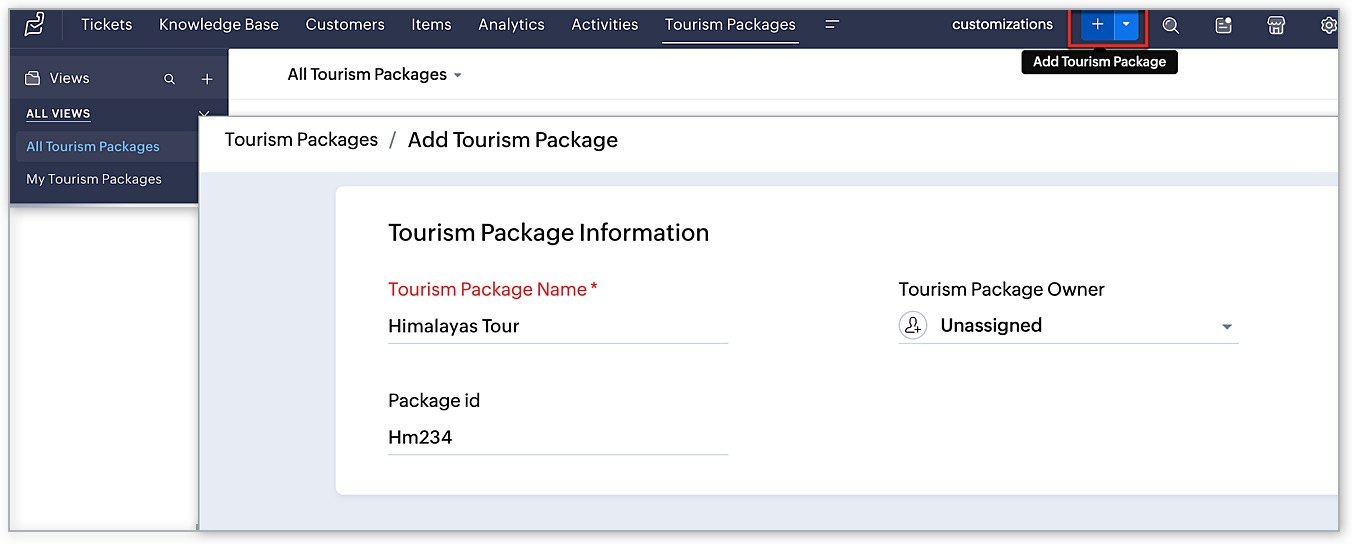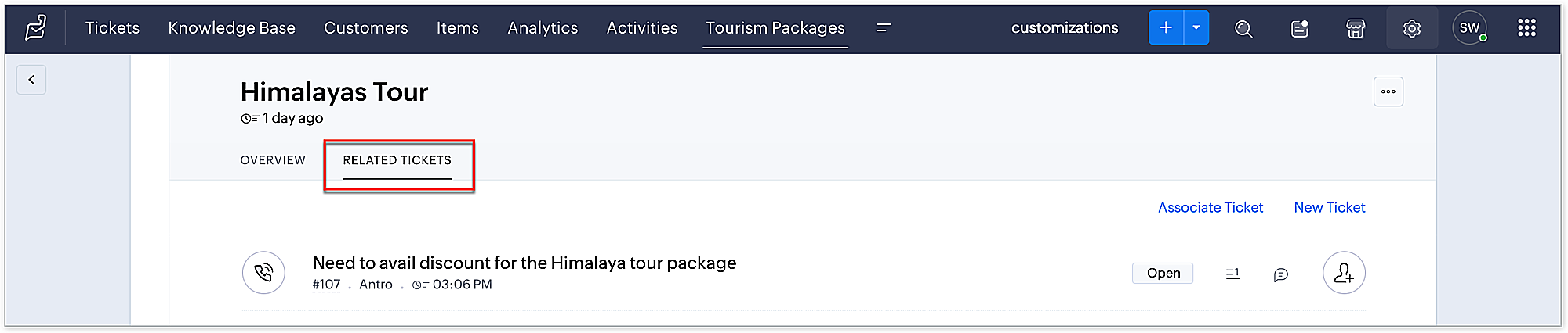一旦添加了查找字段,就会在链接模块中自动创建子选项卡,提供相关记录的360度视图。 例如,在创建查找字段时,可以创建一个名为相关的工单 的相关子选项卡。 此子选项卡将显示在旅游套餐模块中。