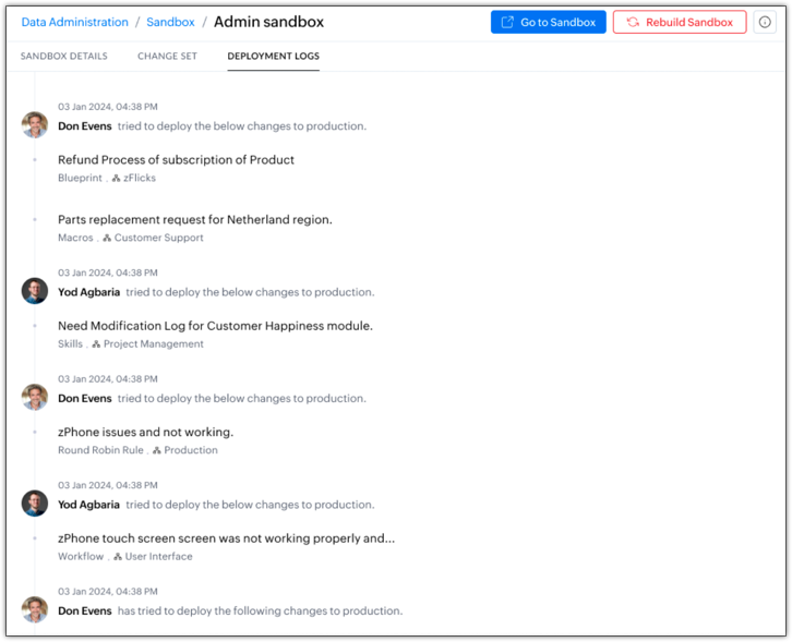 具有管理沙盒权限的用户可以将更改部署到生产帐户。 沙盒允许用户测试和评估所有配置,但是只有选定的更改才能部署到生产账户。 可以部署的更改列在‘ 更改集合’ 下面。
