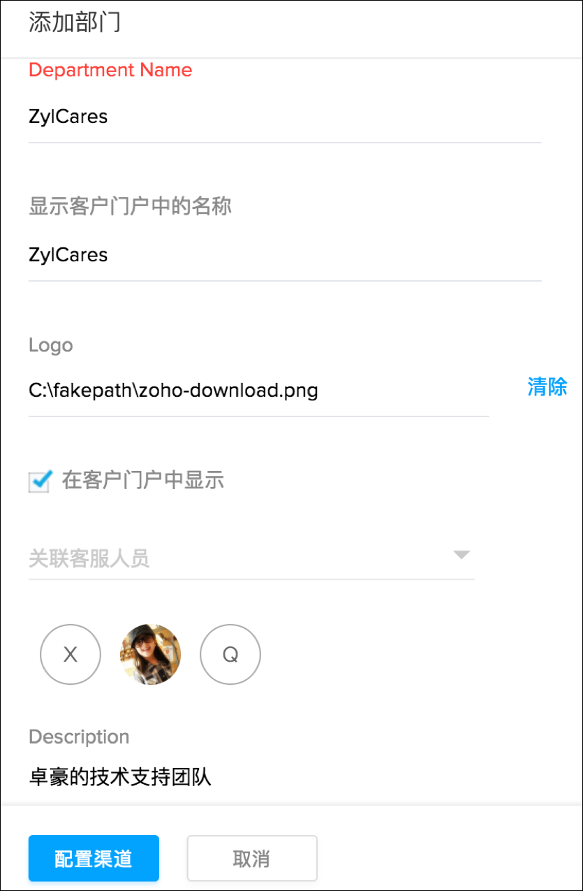 - Logo: 浏览并选择部门的logo。logo是用于识别帮助中心内的部门