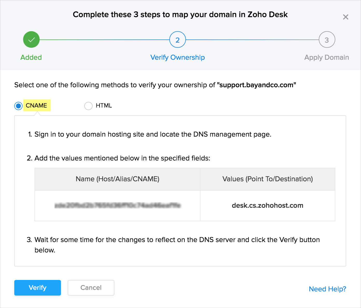 CNAME方法需要您在DNS管理中心添加显示于Zoho Desk内的唯一码。一旦您添加CNAME记录,请点击设置向导中显示在"CNAME方法" 选项下的"验证"。