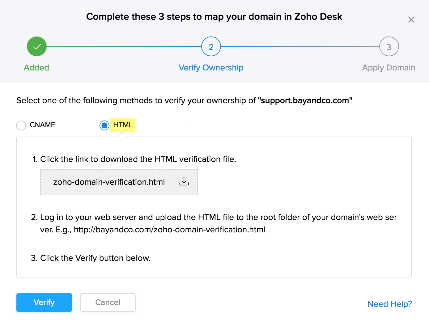 - 点击"HTML"选项下面的验证。这将提示Zoho Desk在您查看它的同一地址检查此HTML文件。一旦我们发现该文件。您的域将会更新为‘已验证’。