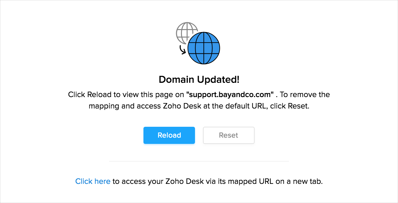 新域将会成功映射至您的Zoho Desk。 - 点击 访问域 以在一个新标签页内打开域。