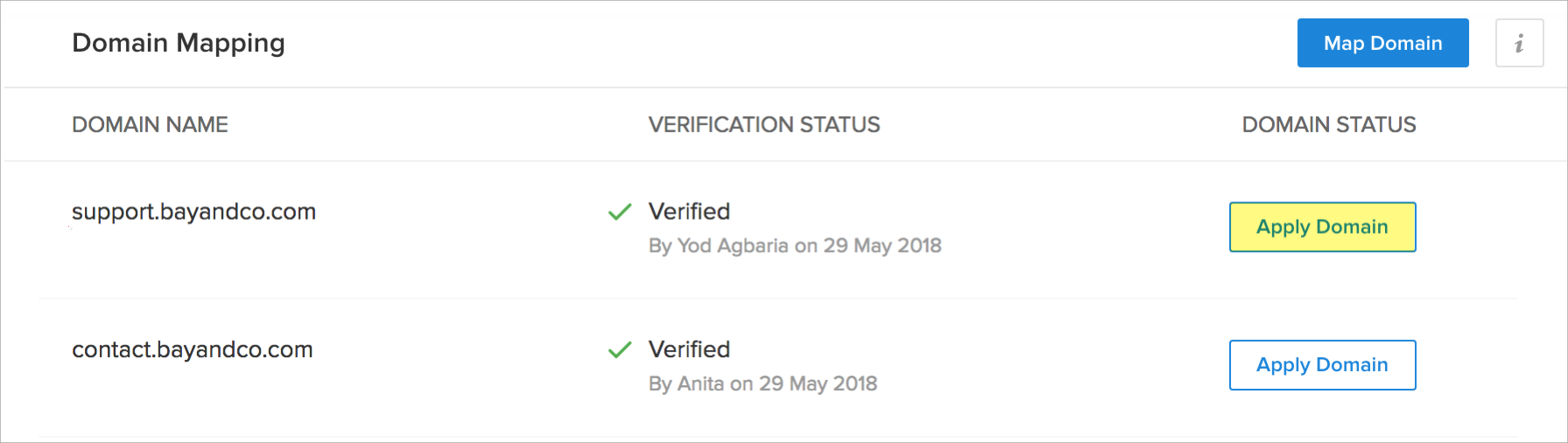 - 在域映射页面,点击您想要应用已验证域旁边的应用域。
