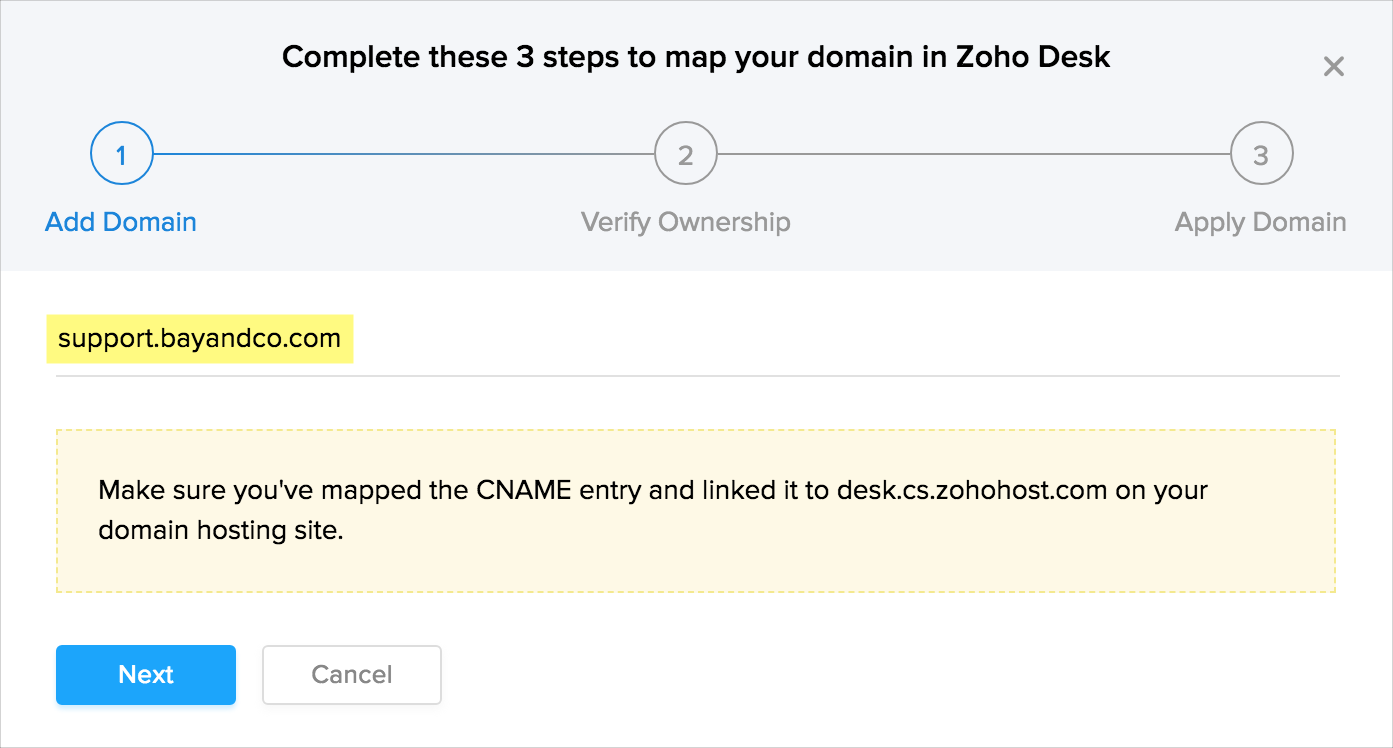现在您已经完成了前提条件,您必须移动至Zoho Desk来指定新的域地址。更改域地址的工作流包含以下3个步骤: