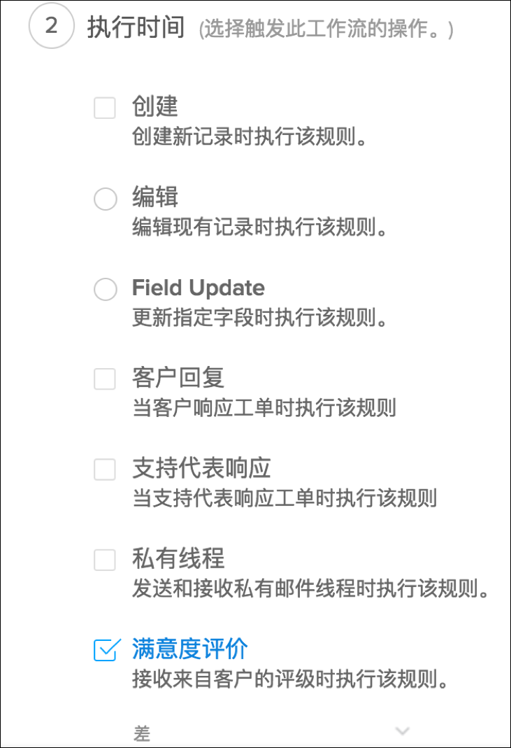 提供提醒名称,例如,跟进差评。 选择一个发送给客户的邮件模板。您可以根据需求个性化此邮件。 选择通知联系人 复选框。 保存工作流规则。当您的客户留下差评时,工作流规则将向您的客户发送个性化的询问邮件,关于如何获得进一步的帮助。定时或监督规则通常,在请求客户反馈之前,客户先需要一些时间来消化他们的支持经验。出于同样的原因,您可以设置一个定时的规则,该规则大约会在关闭一个工单的24个小时之后触发一个包含评级占位符的邮件。然而,您可以在这里学习如何创建定时规则,让我们来看看在上面的情况下创建一个定时规则。