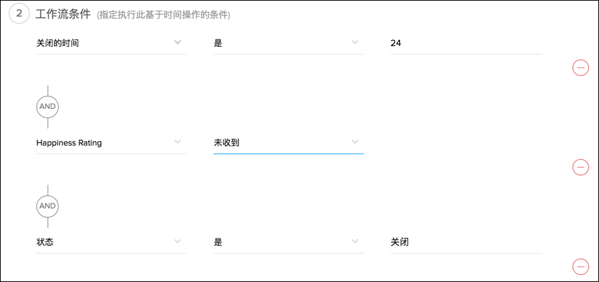 步骤 1: 输入规则名称并将工作时间指定为日历时间。步骤 2: 在规则条件部分,指定: <关闭之后的时间> 是 <24> (与)<满意度评级> <未收到> (与)<状态> 是 <关闭>步骤 3: 在操作下,创建新提醒并实行以下步骤: