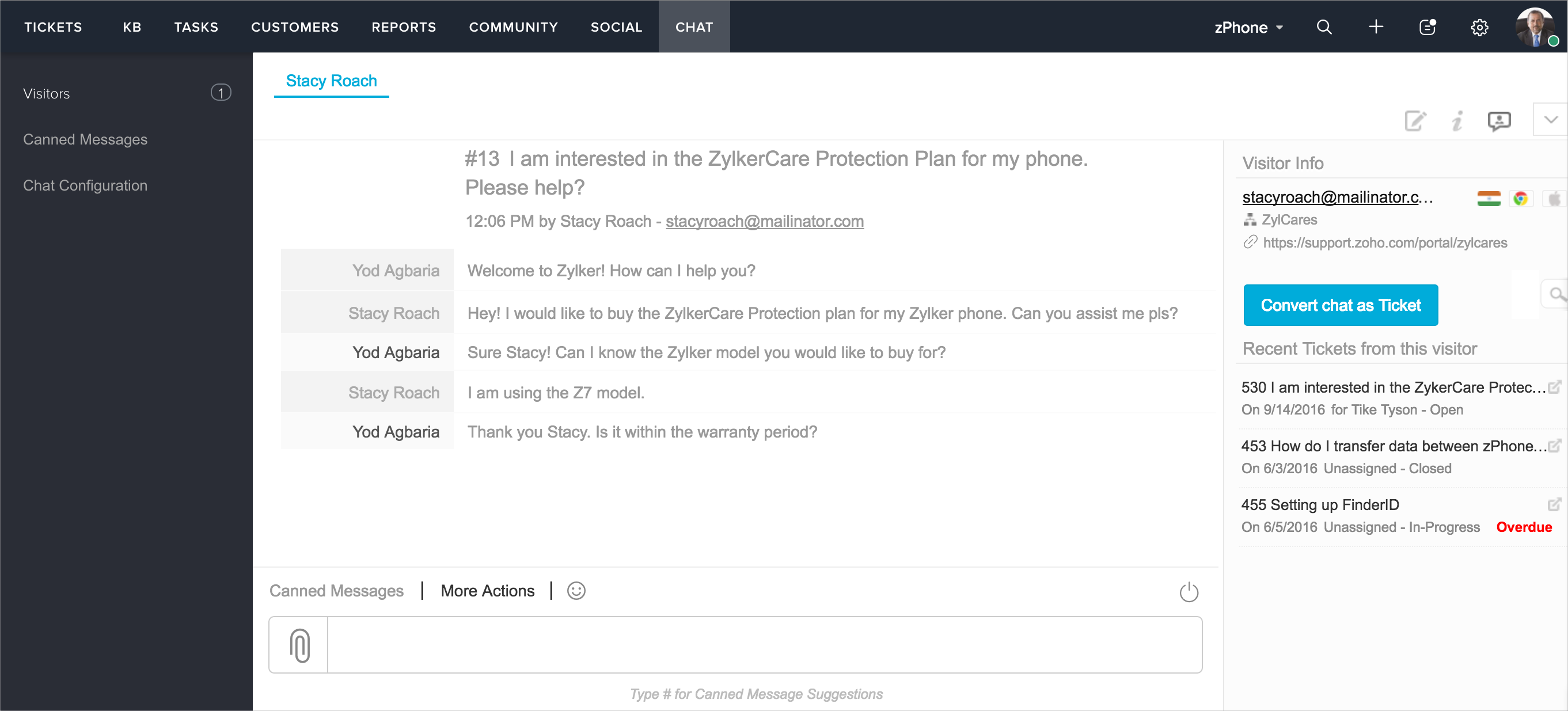 您可在聊天仪表板中与访客聊天及查看其详细信息。当您选择一个聊天时,系统会将您重定向至 Zoho Desk 中的聊天仪表板 [模块]。在聊天会话结束时,谈话记录将保存为工单。