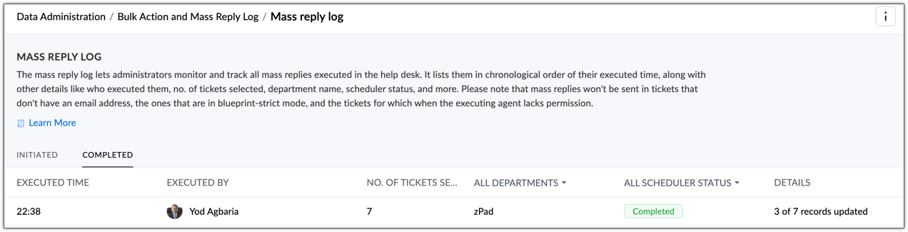 - 已发起 - 在队列中,尚未交付的电子邮件可以在这里查看。 对于每个群发回复,将显示邮件发送的日期和时间、客服人员名称、回复的工单数量和工单所属的部门..