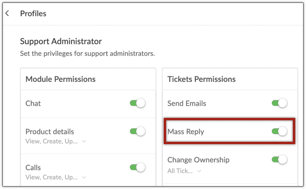 每个部门都应该启用批量回复。默认情况下,管理员具有批量回复的权限。 他们可以根据需要为其它角色启用它。
