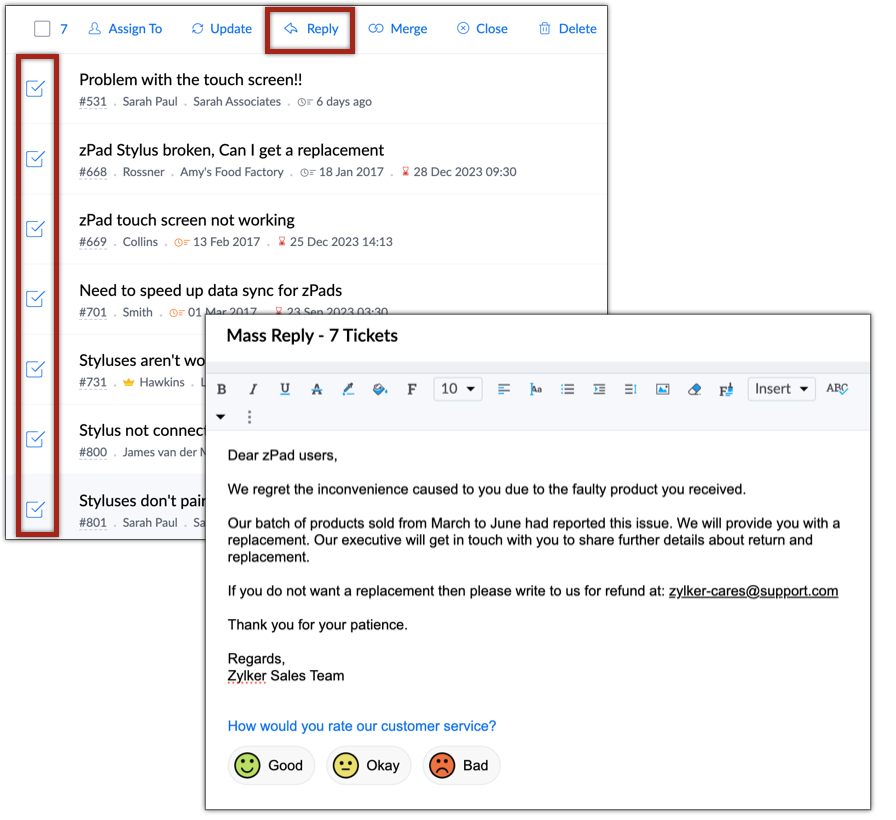 请注意,批量回复只能发送给那些关联了电子邮件地址的工单。